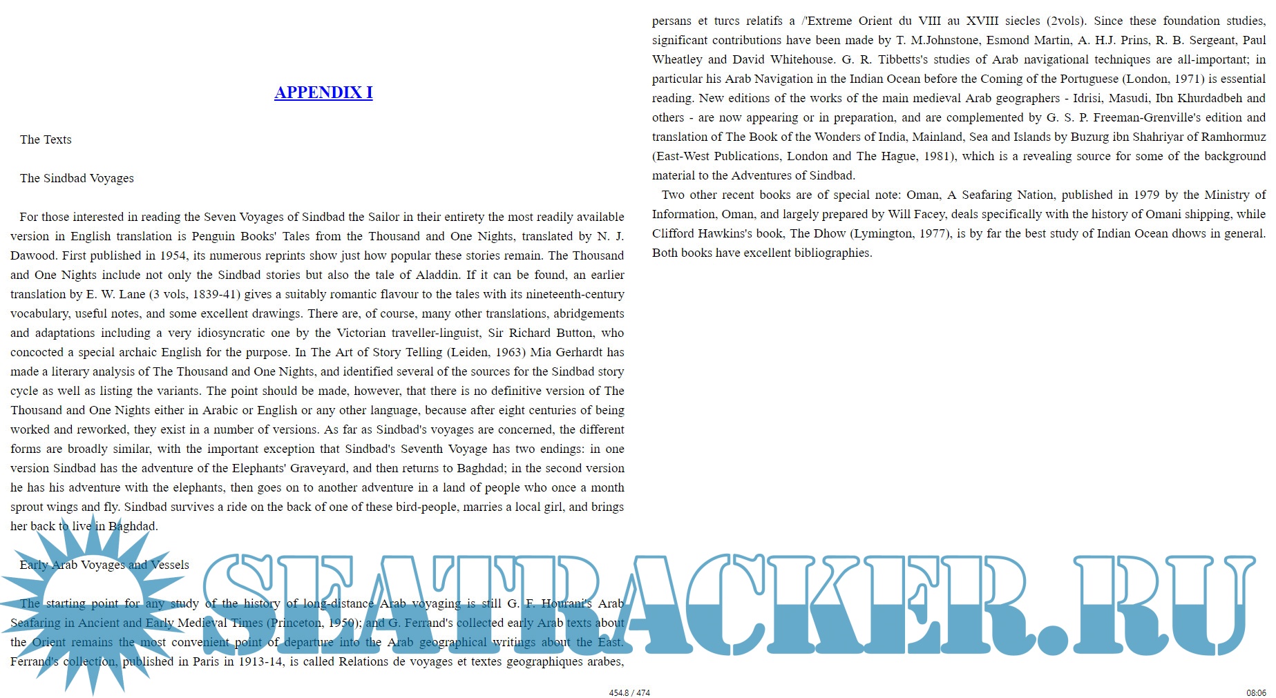 Year: 2018 Language: english Author: Tim Severin Genre: Fiction Publisher: Lume Books Format: EPUB Quality: eBook Pages count: 239 Description: Sindbad. Perhaps the greatest fictional sailor of them all. But could his amazing voyages, recounted in the The Book of One Thousand and One Nights, be recreated in the modern world? Or were they just the stuff of legend? Tim Severin was determined to find out. After three years of research, he created a precise replica of an early Arab trading ship. Not a single nail was used in her construction - her planks were held together with 400 miles of coconut cord. With a crew of twenty, including eight Omani sailors, his ship Sohar (named after the town said to have been Sindbad’s birthplace) completed a 6,000 mile journey by way of India, Sri Lanka, and across the Indian Ocean to Sumatra and Singapore, and finally through the China Sea to a tumultuous welcome in Canton. Along the way, the crew had to swim among sharks while repairing the rudder, catch rainwater to drink while becalmed in the doldrums, and endure the battering of violent seas off the coast of Vietnam. 'The Sindbad Voyage' is the remarkable story of that amazing journey. An enthralling saga of the 7 ½ month voyage, it is one of the most memorable sailing stories of modern times.