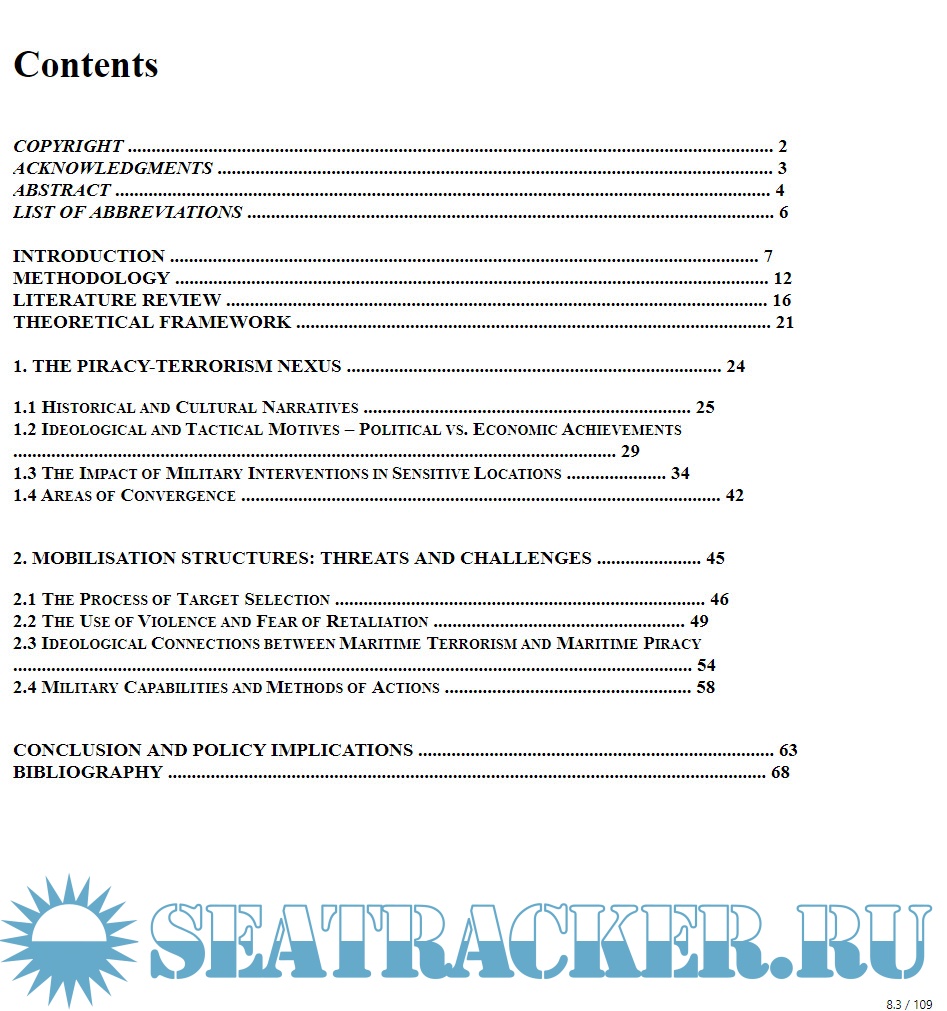 Description: This project investigates the nature and implications of terrorism and contemporary maritime piracy, drawing a comparative analysis on two relevant spheres of conflict: the Gulf of Aden and the Strait of Malacca. In doing so, the research is conducted within two scopes of investigation. On the one hand, the transition from domestic to transnational terrorism is portrayed by the events of 9/11, hereby representing a historical shift in the field of global security. This will be emphasised by the significant progression of jihadism from 1979 to 2015. This study incorporates the use of qualitative discourse analysis, through the prism of a social constructivist approach combined with the concepts of embedded liberalism and neo-patrimonialism. The empirical data relies on the use of illustrative examples: 9/11, the Abu Sayyaf Group, Somalia, the Strait of Malacca, and a host of other secondary examples referring to Northern Ireland’s IRA, Boko Haram in Nigeria and the Gerakan Aceh Merdeka (GAM) in Indonesia. The study finds that the use of violence is a common characteristic of both actors, sharing similar ideological and tactical motives with mutual intentions to create chaos and provoke instability. Meanwhile, the differences are illustrated throughout the fact that terrorist groups’ interests are mainly of political nature, whereas pirates are driven by financial objectives. The dissertation contributes to the literature with the use of a distinct theoretical framework by shedding light on political, economic, social and cultural aspects that constitute the piracy-terrorism nexus.