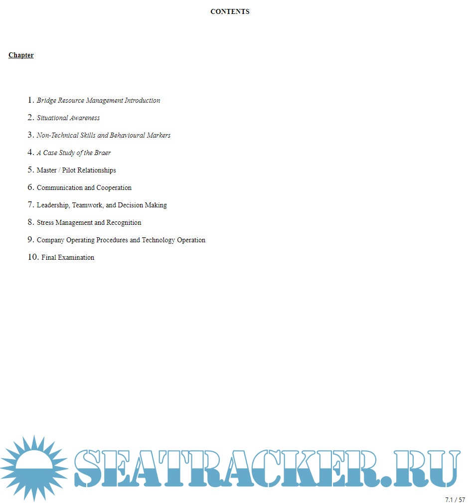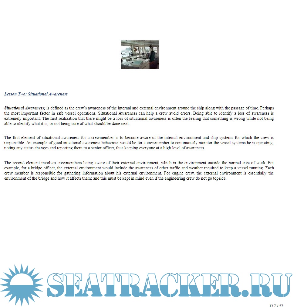 Description: A maritime training course for ships officers suitable of use as a comprehensive introduction to the theory of Bridge Resource Management (BRM). Available in print or download for study at home or at sea. representing the latest Bridge Resource Management operating practices and teamwork management techniques using the principles of non-technical skills evaluation to ensure the safety of the ship, its personnel, cargo, the protection of the environment, and to satisfy the requirements of the STCW in accordance with recommended practices of the IMO, NTSB, and USCG.