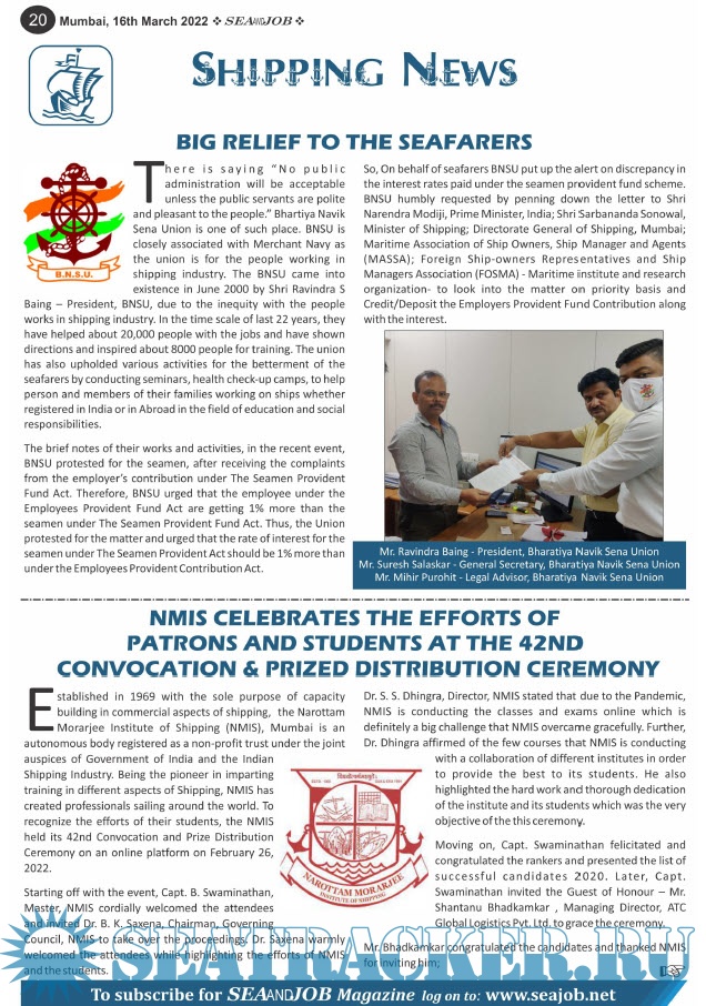 Description: The Sea and Job magazine launched in May 2007, was the second venture of Sea Line Group succeeding Seajob.netBringing the much renowned essence to the Group, the Sea and Job Magazine quickly gained popularity, becoming the No. 1 Shipping Magazine that came to be widely circulated all over India. Sea and Job over the years has evolved as the most trusted, ethical, objective and read maritime publication that possesses a large database of subscribers from various verticals in the industry. The magazine provides informative and interesting articles covering not just the shipping world but also the world outside it. Sea and Job is also a medium for the shipping/ manning companies to advertise marine jobs and also to promote their organization by publicizing internal activities like seminars, sports events and parties.Some notable endeavors of the magazine include the Know Your Recruiter Column, the Sailing Episodes Column and the Marine Insights section. The consistent efforts and the dedication to provide extraordinary services to the industry has resulted in the magnifying popularity and patronage of Sea and Job Magazine currently extending to 70-72 pages.