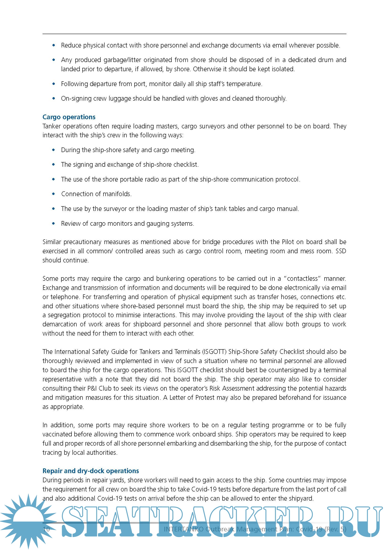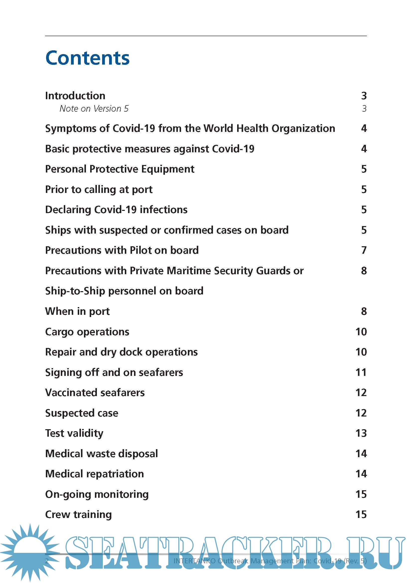 Description: This document outlines the plans and procedures to be put in place to prepare a ship for shore personnel to come on board and to protect seafarers from the dangers posed by the new Coronavirus disease (Covid-19). This includes potential exposure from shore personnel and the actions to take in the event of a suspected case on board.
