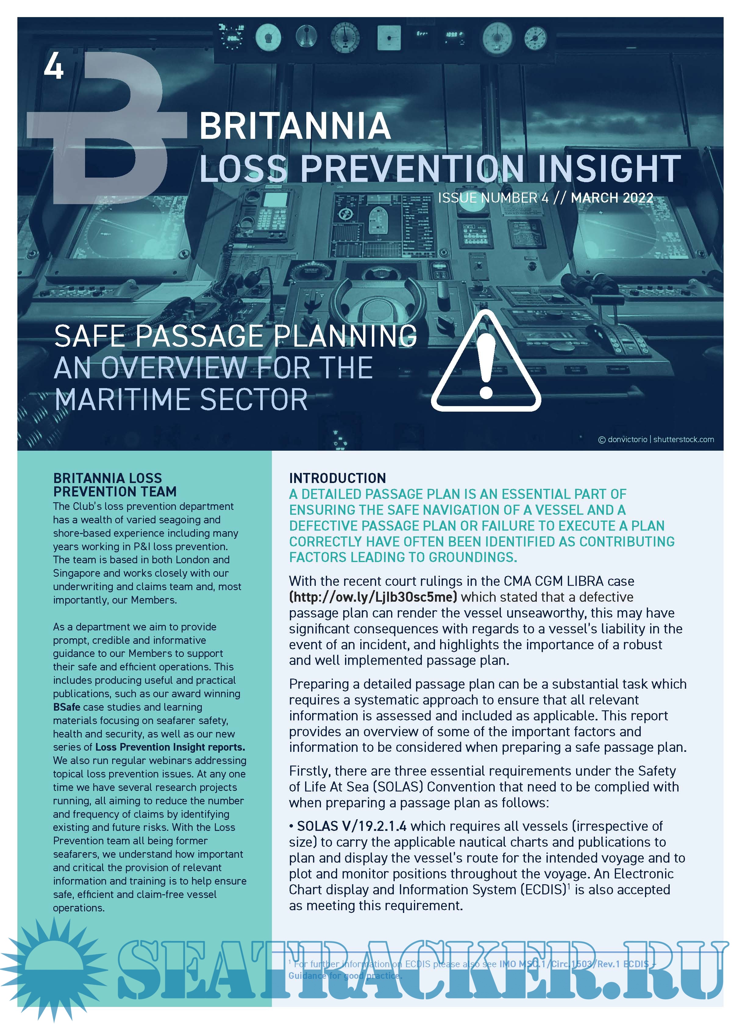 Year: 2022 Language: english Author: Britannia P&I Club Genre: Other Format: PDF Quality: eBook Pages count: 12 Description: Preparing a detailed passage plan can be a substantial task which requires a systematic approach to ensure that all relevant information is assessed and included as applicable. This report provides an overview of some of the important factors and information to be considered when preparing a safe passage plan. There are three essential requirements under the Safety of Life At Sea (SOLAS) Convention that need to be complied with when preparing a passage plan.