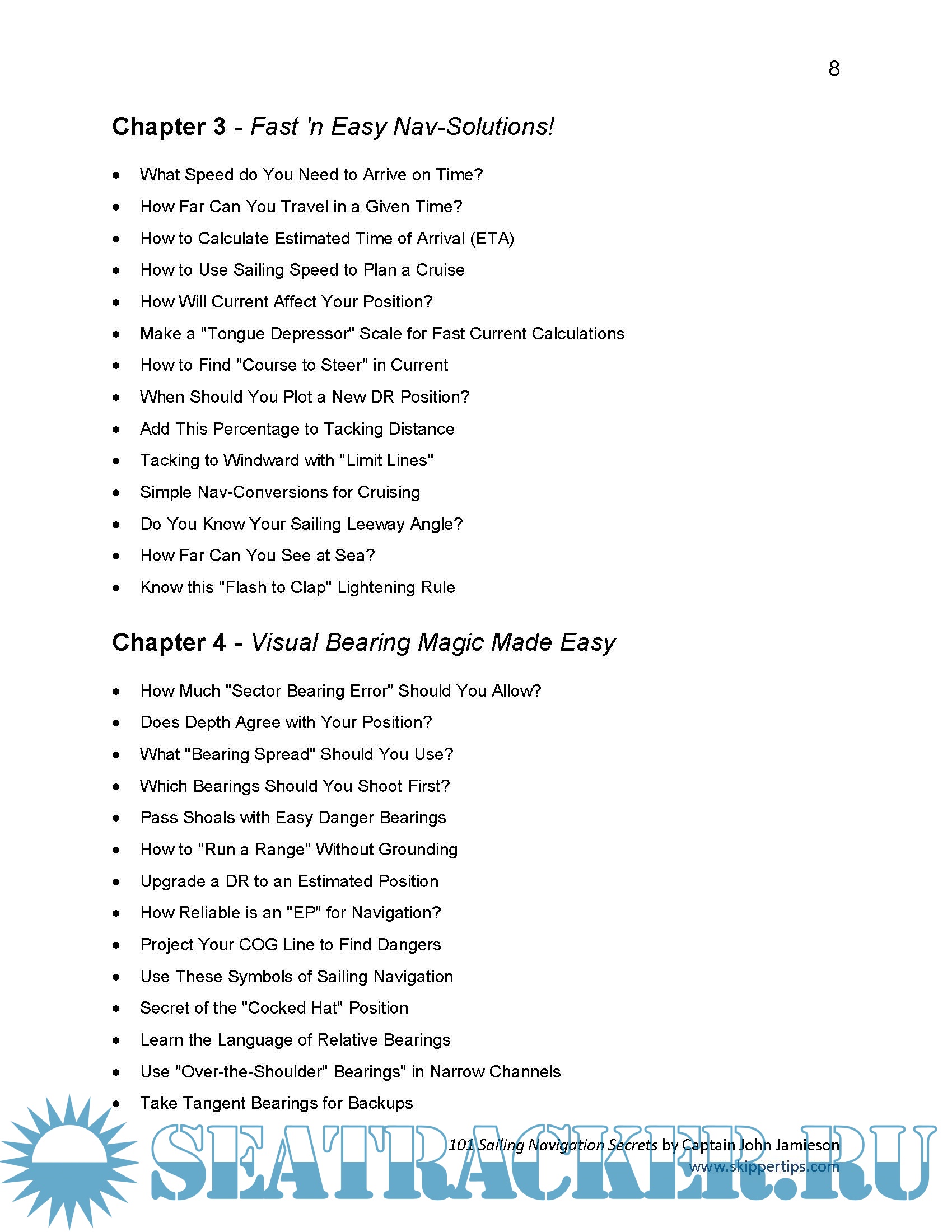 Year: 2013 Language: english Author: Captain John Jamieson Genre: Handbook Format: PDF Quality: eBook Pages count: 157 Description: If you are anything like me, navigation can overwhelm even the saltiest of sea dogs. But that's not all--a sailboat will heel, roll, pitch and yaw from time to time. That makes navigation on a small vessel a challenge. Throw in a handful of common tasks like steering, sail trim, reef the mainsail, change out the headsail, make a meal or repair an ornery system or mechanical device. Who has time for navigation? But there's a sailing solution that you may not know - 90% of all sailing navigation can be completed before you cast off or weigh anchor. This #1 sailing secret can make your navigation underway safer and easier! In this eBook, I'll show you how to save time and effort with specific sea-tested navigation tips that are simple to remember and retain. Unlock the secrets the pros use to make navigation easier than ever before. Slice 50% or more off the time it takes to plot a position with this powerhouse "two-for-one" tool. Find out how to access hundreds of $$$s worth of super valuable sailing navigation charts and publications in just seconds--for free! Tap into hidden techniques you can use with any GPS, chart plotter, or radar to make navigation under sail safer worldwide! Put these solid, sea-tested navigation tips into play aboard your small sailboat immediately. Keep your sailing crew and partners safe and sound on the waters of the world--wherever you choose to sail or cruise! Enjoy the read.