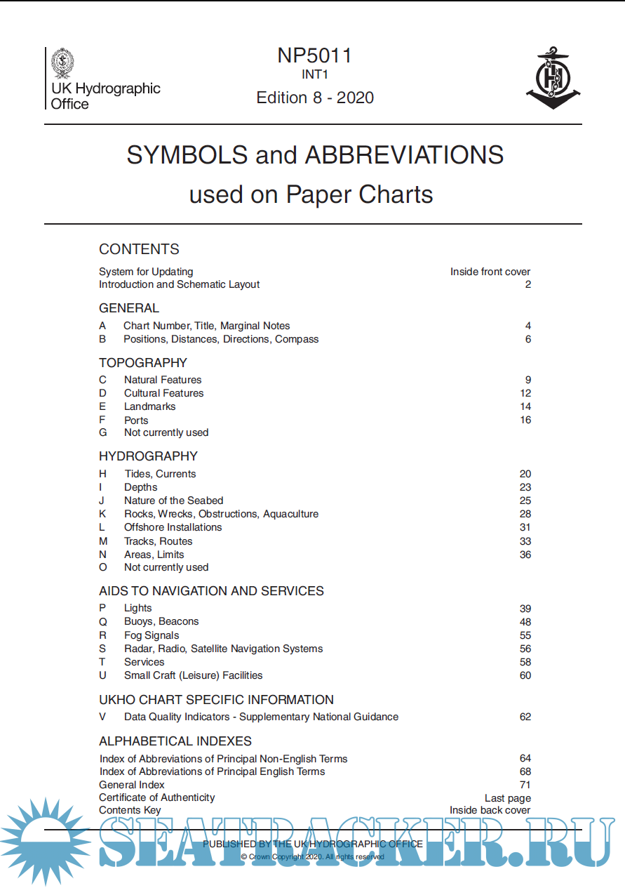 Year: 2020 Language: english Author: UKHO Edition: 8th Format: PDF Quality: eBook Pages count: 84 Description: Gives details on symbols and abbreviations used on the worldwide range of ADMIRALTY charts, and international Chart Series Paper Charts. It also contains information on hydrography, topography and navigational aids and services. • Admiralty and INT (from the international chart series) symbols clearly illustrated in full color • Hydrography - the nature and conditions of the seabed • Topography - natural and man-made features • Navigational aids and services• Abbreviations of principal English and foreign charts • General information on the content of Admiralty Charts