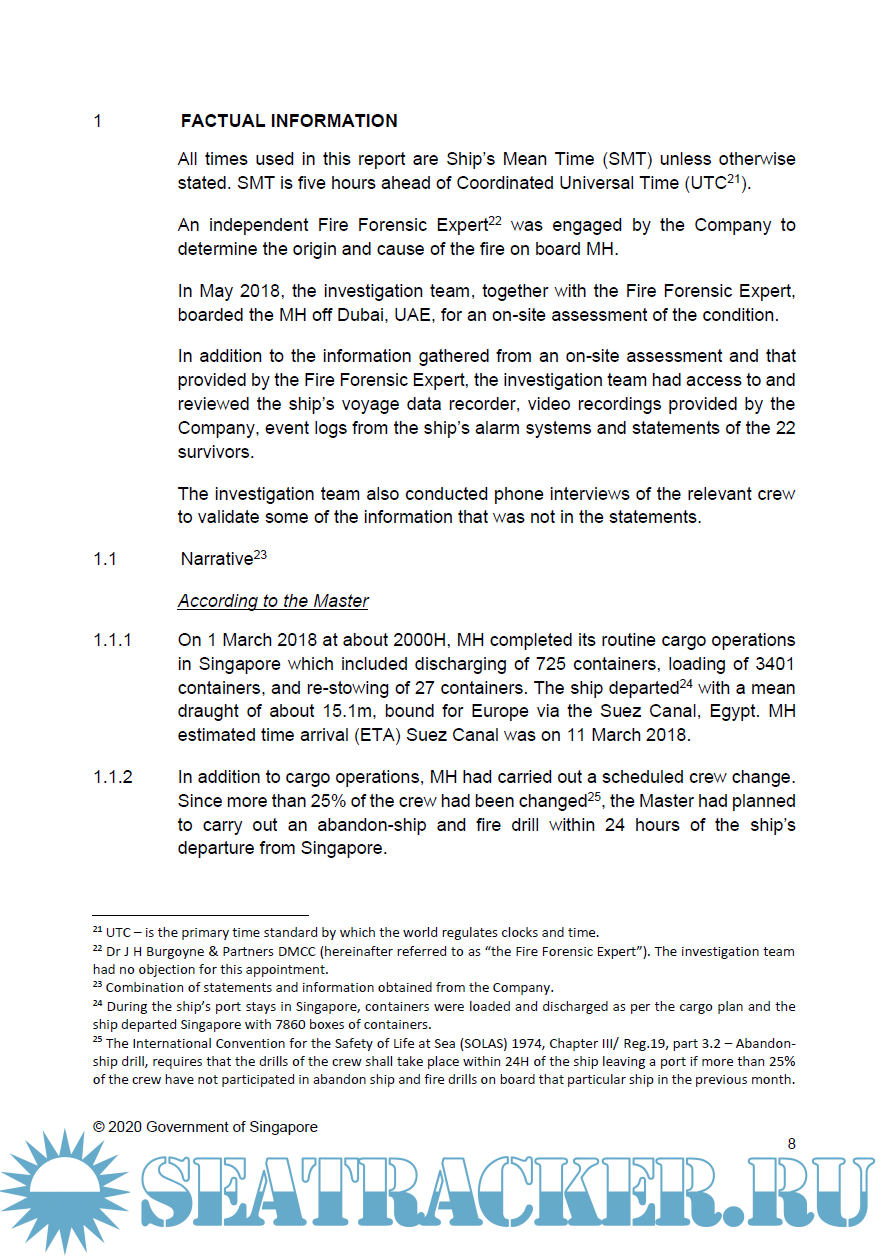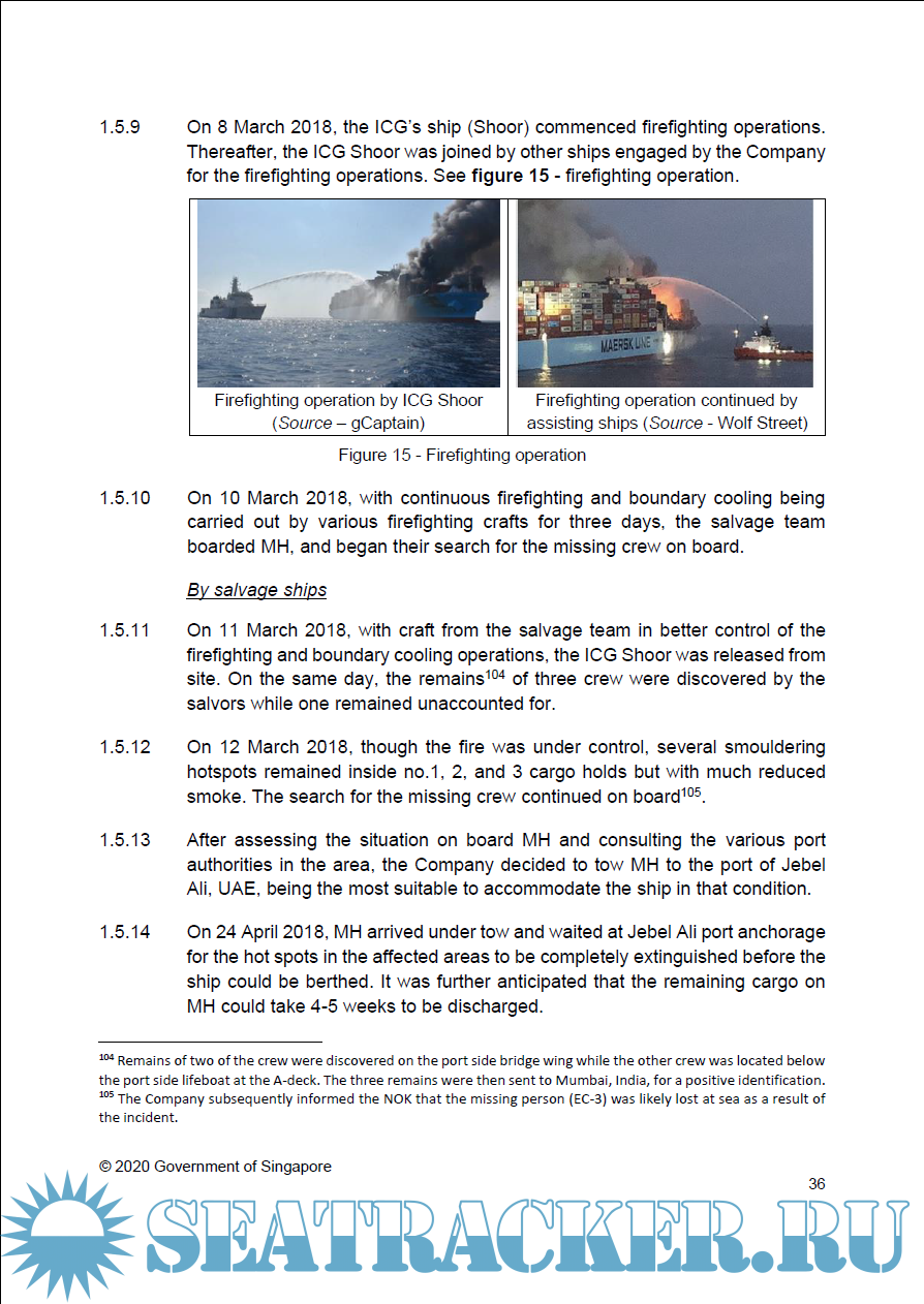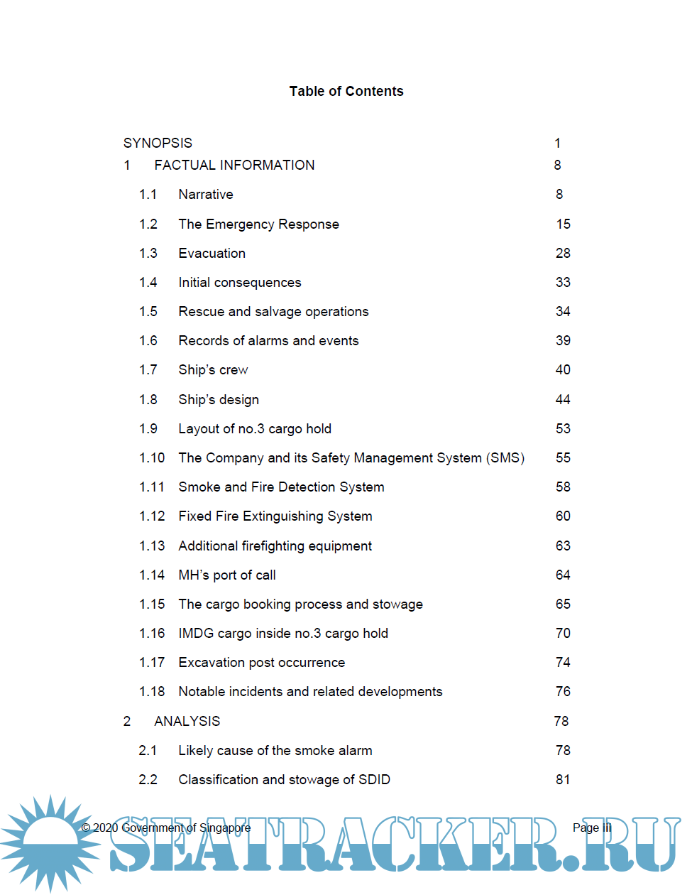 Year: 2020 Language: english Author: Transport Safety Investigation Bureau - MOT Singapore Format: PDF Quality: eBook Pages count: 102 Description: On 6 March 2018 at about 1945H (Local Time), in fine weather, the Singapore registered container ship Maersk Honam (MH), which was carrying 7860 containers, while en route from Singapore to Suez Canal, encountered a severe fire that started from no.3 cargo hold when the ship was in the Arabian Sea, about 900 nautical miles west of the coast of India. All the 27 crew responded to fight the fire by commencing boundary cooling and subsequent release of carbon dioxide (CO2) into the cargo hold but were not successful in extinguishing the fire. The crew sent out a distress signal and eventually abandoned ship at about 2215H. On 7 March 2018 at about 0130H, another ship, the ALS Ceres1, which had responded to the distress signal, picked up a total of 23 crew from the lifeboat. Four crew members were reported unaccounted for and declared missing. Search and Rescue (SAR) operations of the surrounding seas were carried out. One of the surviving crew succumbed to the injuries while en route ashore for medical treatment. The TSIB classified the occurrence as a very serious marine casualty and launched an investigation.