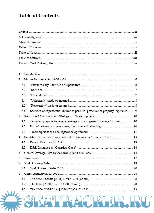 The chapter before the last contains an outline of the York Antwerp Rules 2016, rule by rule, in a summary form. The last chapter is an appendix of summary of general average cases decided by the English courts in the last decade from 2012 to 2021.