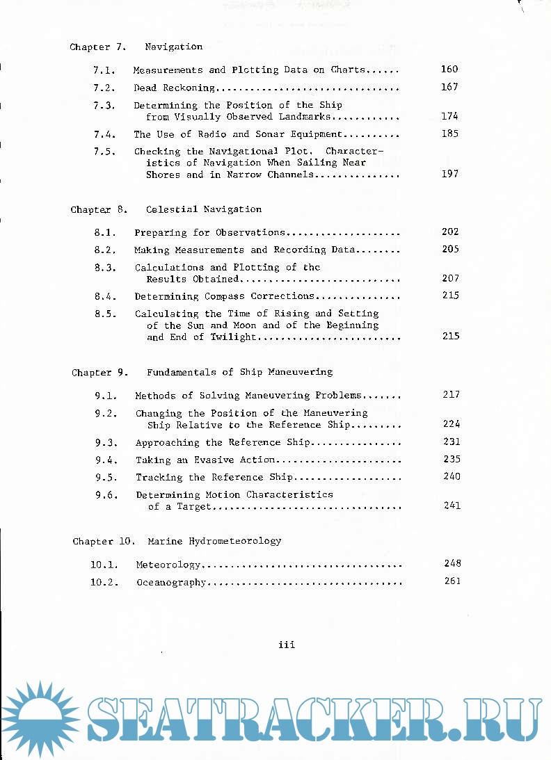Year: 1967 Language: english Author: Pronichkin A.P. and many Others Genre: Handbook Publisher: Naval Intelligence Support Center Format: PDF Quality: eBook Pages count: 412 Description: Contents: Duties of the officer of the watch; Submarines; Surface vessels; Regulations for preventing collisions at sea and certain other rules regulating movement of ships in the coastal waters; Navigation; Celestial navigation; Principles of ship maneuvering; Shipboard communication systems and rules governing their use; Seamanship; Brief information on international maritime law; Reference data. Color illustrations reproduced in black and white. "GOVERNMENT USE ONLY"