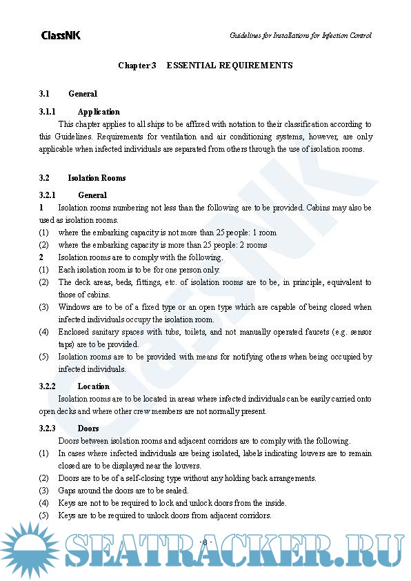 Year: 2022 Language: english Author: ClassNK Genre: Normative document Format: PDF Quality: eBook Pages count: 24 Description: For ships engaged in international voyages, the primary control measure adopted to date against the spread of infectious diseases has been quarantines. For all intents and purposes, however, quarantines do very little to prevent the transmission of infectious diseases among individuals on board a ship due to the nature of onboard accommodation environment that makes it extremely difficult to control their spread. This Guidelines for Installations for Infection Control (hereinafter referred to as the “Guidelines”) applies to ships (excluding passenger ships) registered with the Nippon Kaiji Kyokai (hereinafter referred to as “the Society”) that have implemented means to minimise the spread of infection diseases on board ship (hereinafter referred to as “infection control measures”) and for which applications for the affixation of special class notation to classification characters are submitted. The infection control measures specified in this Guidelines primarily apply to the installations, systems, equipment, and other means adopted by ships. This Guidelines also applies to the provision and use of medicines as well as medical devices and equipment not specifically referenced within, but such matters are also to be considered separately.