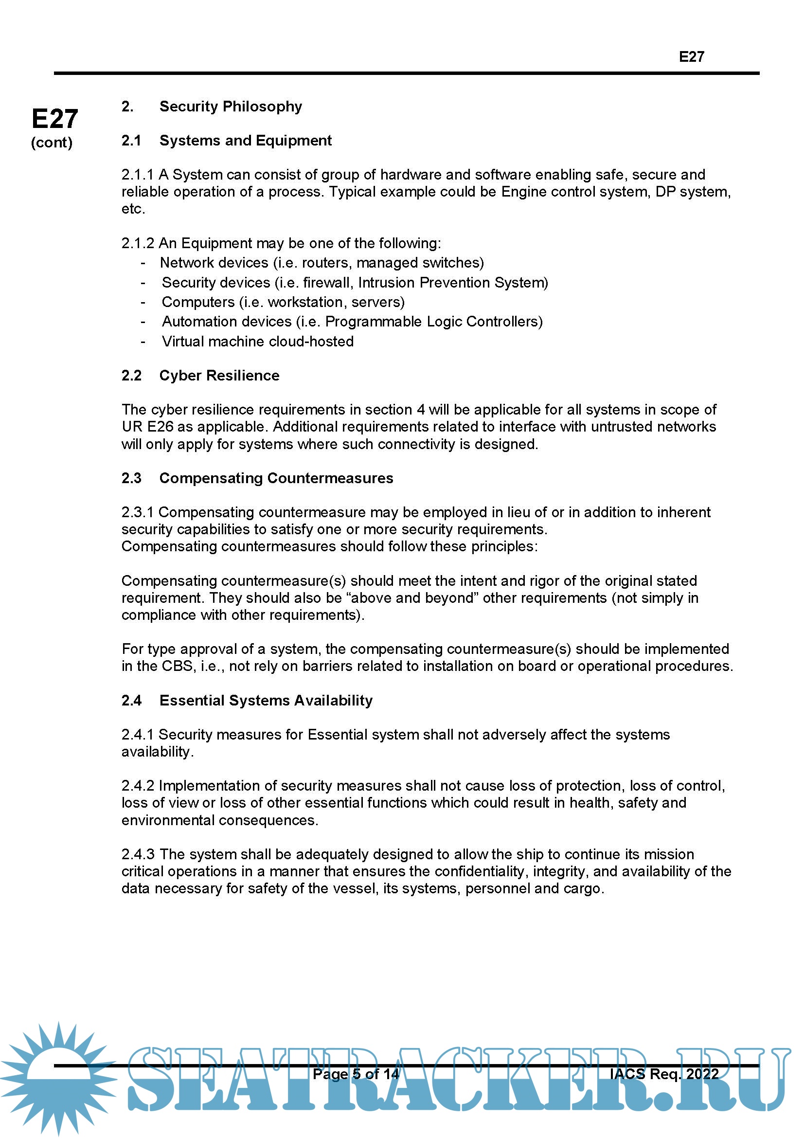 Description: UR E27 aims to ensure system integrity is secured and hardened by third-party equipment suppliers. This UR provides requirements for cyber resilience of onboard systems and equipment and provides additional requirements relating to the interface between users and computer-based systems onboard, as well as product design and development requirements for new devices before their implementation onboard ships.