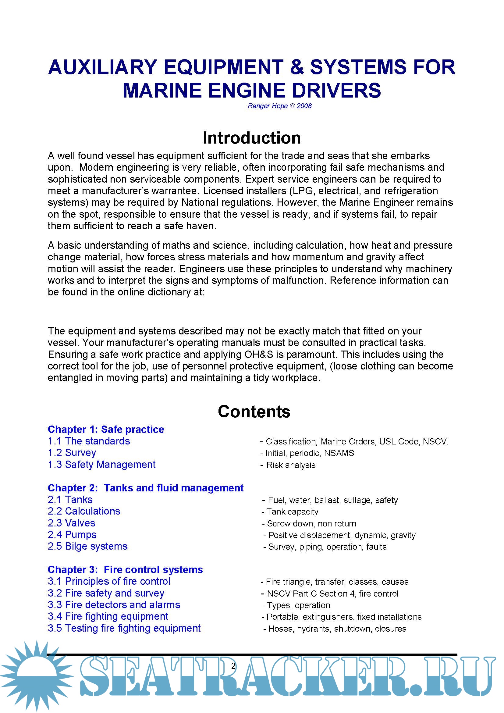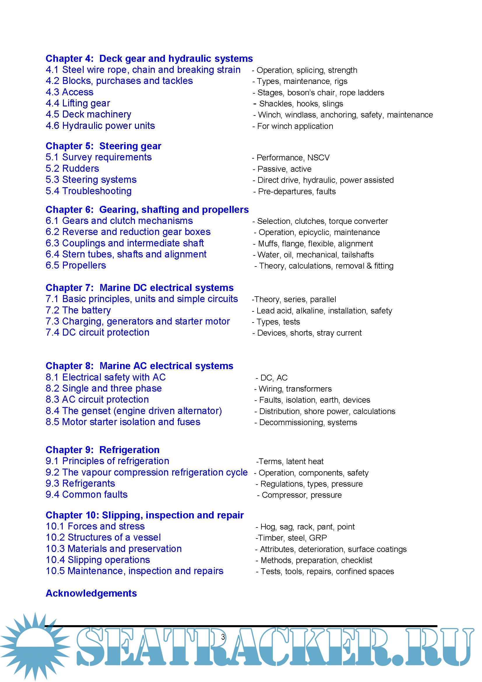 Year: 2008 Language: english Author: Ranger Hope Publisher: Unknown Format: PDF Quality: eBook Pages count: 233 Description: A well found vessel has equipment sufficient for the trade and seas that she embarks upon. Modern engineering is very reliable, often incorporating fail safe mechanisms and sophisticated non serviceable components. Expert service engineers can be required to meet a manufacturer’s warrantee. Licensed installers (LPG, electrical, and refrigeration systems) may be required by National regulations. However, the Marine Engineer remains on the spot, responsible to ensure that the vessel is ready, and if systems fail, to repair them sufficient to reach a safe haven. A basic understanding of maths and science, including calculation, how heat and pressure change material, how forces stress materials and how momentum and gravity affect motion will assist the reader. Engineers use these principles to understand why machinery works and to interpret the signs and symptoms of malfunction.