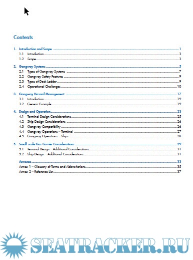 This document first provides guidance on shore gangways when used on large gas carriers and then highlights specific challenges for smaller ships. The main focus of the guidance is to provide items to consider when designing a gangway system and during the design of the ship landing area. The guidance also encourages a structured approach to hazard management through the use of risk assessments.