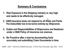 Year: 2005 Language: english Author: Tony Fernandez Publisher: Mumbai Maritime Training Institute, India Format: PPT Quality: eBook Pages count: 30 Description: Presentation Objectives: 1. To enumerate the nature and extent of Risk Exposure to a Shipowner and to Seafarers. 2. To discuss Principles of insurance and the nature and extent of H&M and P&I Cover for Shipowners. 3. To describe the responsibilities of Shipowners and Seafarers under a H&M Policy of Insurance. 4. To appreciate the process of Claims Settlements and be proactive in case of an accident.