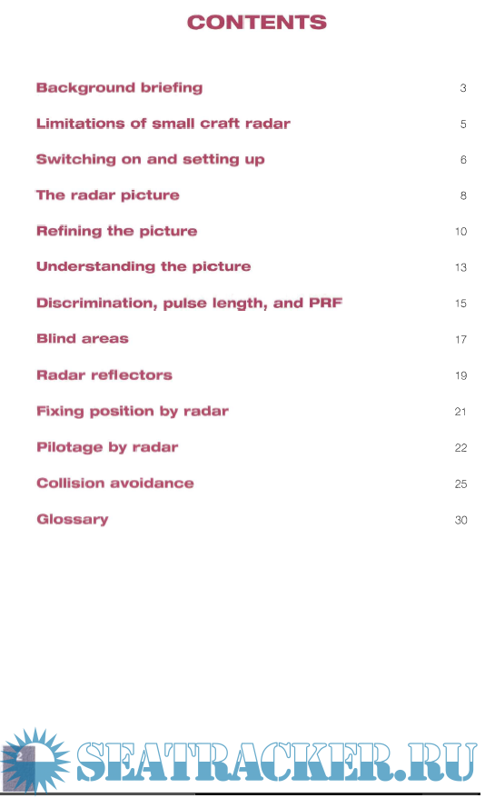 Description: The Royal Yachting Association (RYA), Southampton, UK, 2005, 33 p. — ISBN: 9781905104109.The RYA'S Complete GuideMarine radar is an electronic device which measures the bearing and distance of solid objects and presents this information in the form of a plan view, showing the location of objects such as land, navigation marks, and other vessels.It works by transmitting short bursts of super high frequency radio energy (called microwaves) and receiving the echoes that are returned when these pulses of energy are reflected back from solid objects.Background briefing