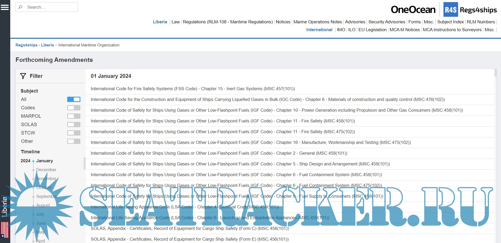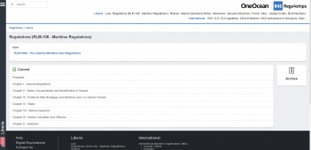 LawRegulationsNoticesMarine Operations NotesAdvisoriesSecurity AdvisoriesFormsMisc.Subject IndexLiberian Legislation (RLM Numbers)International:International Maritime Organization (IMO)Circular LettersCircularsCodesForthcoming AmendmentsGuidelinesInternational Maritime Dangerous Goods (IMDG) CodeManualsMARPOLOther ConventionsPerformance StandardsResolutionsSOLASSTCWUnified InterpretationsInternational Labour Organization (ILO)EU LegislationMCA M NoticesMCA Instructions to SurveyorsScreenshots