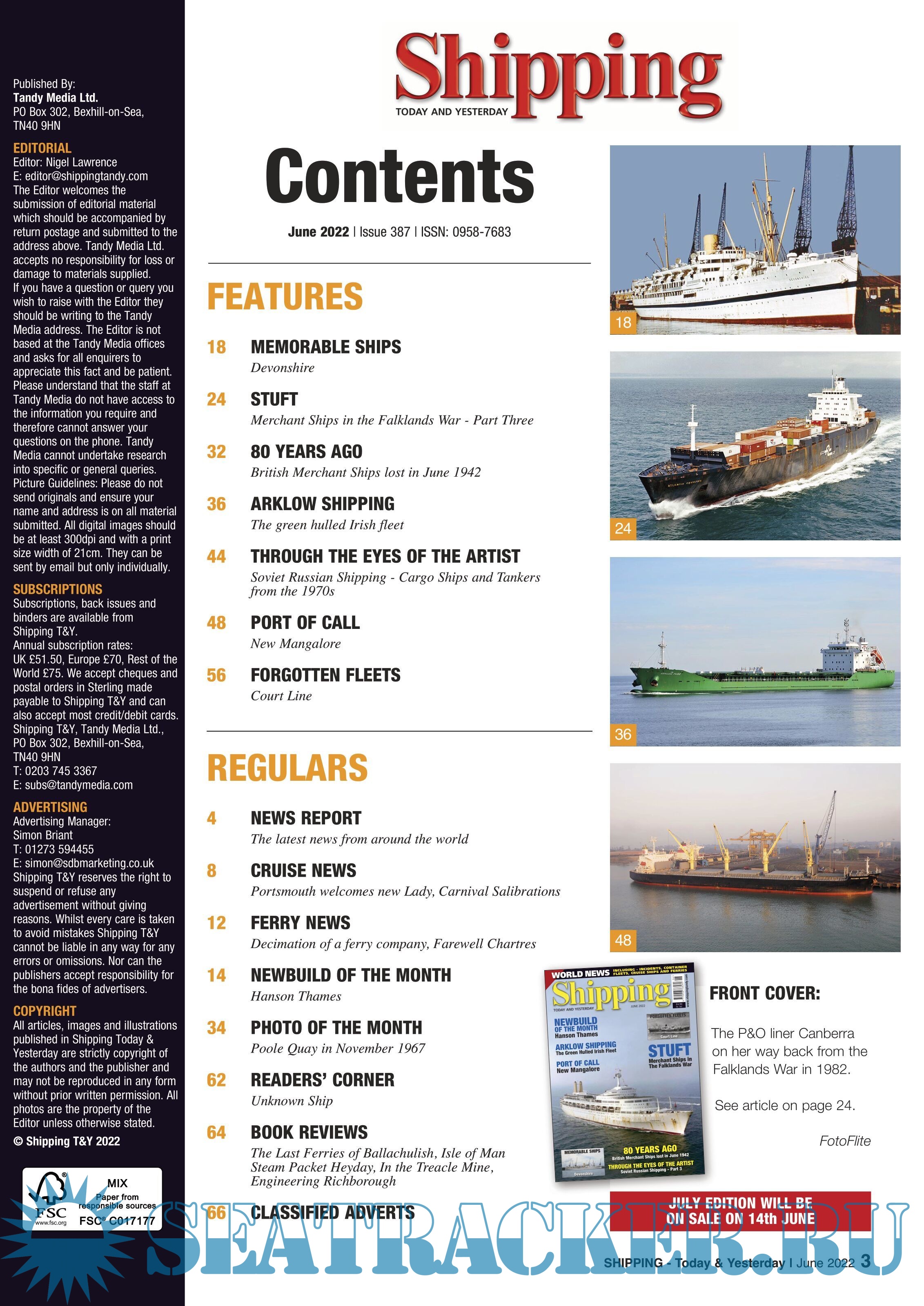 Year: 2022 Language: english Author: Nigel Lawrence (Editor) Genre: Periodical (magazine) Publisher: TANDY Media Format: PDF Quality: eBook Pages count: 68 Description: Shipping Today & Yesterday is a specialist magazine for the shipping enthusiast offering up-to-date information, topical and in-depth historical articles. Shipping Today & Yesterday was first produced in March 1990 by, the then Editor and Publisher, John Young. The first edition stated that it would, “offer a news service covering important developments in the Shipping industry Today and will look back at ships and events of Yesterday, with regular features on merchant ships.” See "Contents" for details Issue No.387 June, 2022