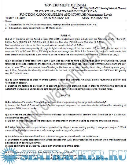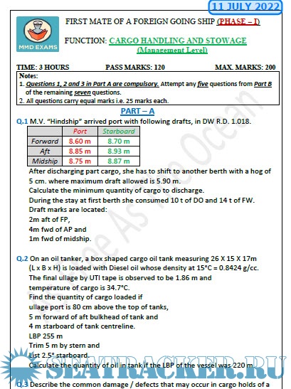 Question Paper Set for Cargo Handling and Stowage (July 2022) for Phase I (Chief Mate F.G.) Mercantile Marine Department (MMD), India Examinations