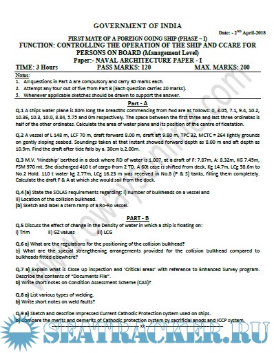 Question Paper Set for Naval Architecture I (July 2022) for Phase I (Chief Mate F.G.) Mercantile Marine Department (MMD), India Examinations