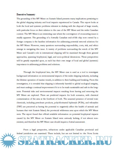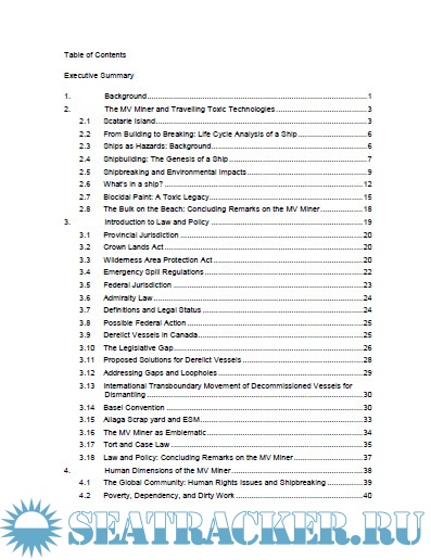 Description: The grounding of the MV Miner on Scatarie Island presents many implications pertaining to the global shipping industry and local impacts experienced in Canada. This report looks at both the local and systemic problems inherent in dealing with the disposal of large vessels, with particular focus on their relation to the case of the MV Miner and the wider Canadian context.