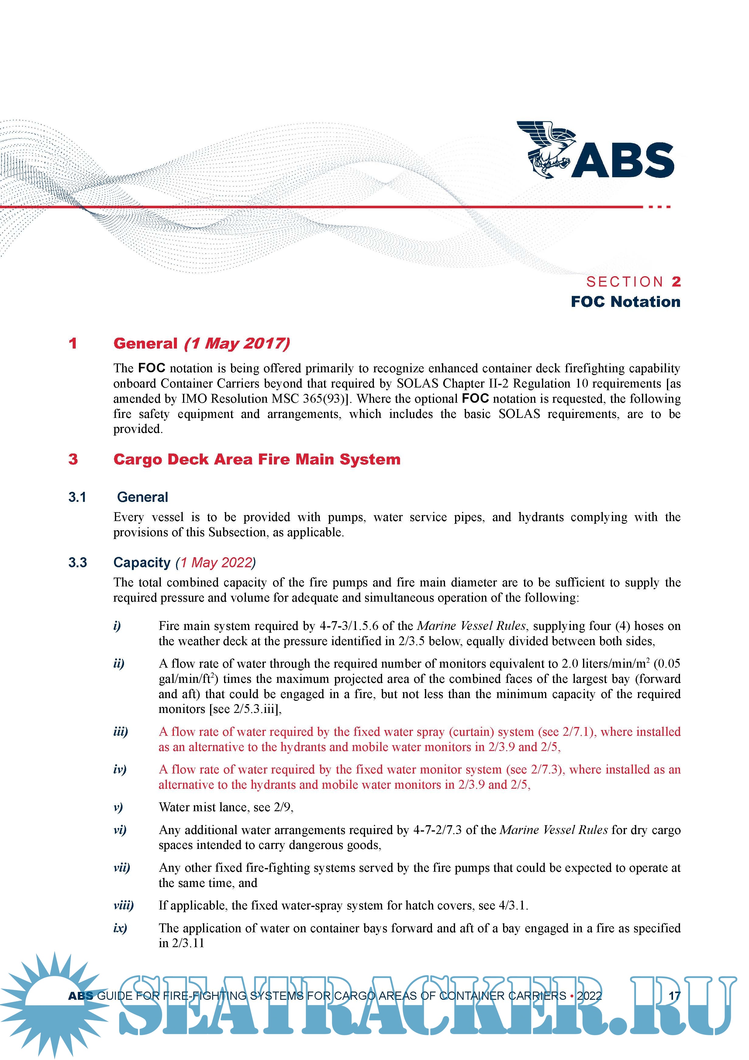 Description: This Guide provides requirements for enhancement of the fire-fighting and fire protection capabilities for cargo areas of Container Carriers beyond that required by SOLAS.