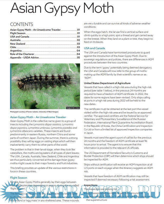 Year: 2022 Language: english Author: NORTH Genre: Practical guide Edition: 2022 Format: PDF Quality: Scanned pages Pages count: 7 Description: Asian Gypsy Moth is the collective name given to a group of insects including the Lymantria dispar asiatica, Lymantria dispar japonica, Lymantria umbrosa, Lymantria postalba and Lymantria albescens varieties. These insects are found predominantly in eastern Russia, northern China and some parts of northern Japan. During the summer, there is a strong possibility they will lay eggs on visiting ships which will then inadvertently carry them to other parts of the world. The problem is that in their larval stage, when they look like caterpillars, the moths are big eaters of all types of plant leaves. The USA, Canada, Australia, New Zealand, Chile and Argentina are thus particularly concerned at the damage Asian gypsy moths might cause to their major forestry and fruit industries. This briefing provides an update of the various restrictions in force in these countries.
