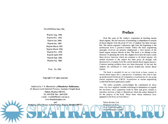 Year: 2002 Language: english Author: D.K. Sanyal Genre: Textbook Publisher: Bhandarkar Publications Edition: 2nd Format: PDF Quality: Scanned pages Pages count: 252 Description: The book is intended for use as a text book in basic courses in marine diesel engine theory and pratice. Candidates who wish to take up professional Certificate of Competency examination in marine engineering would find the book particularly useful. Additional info: This edition has been enlarged by new additions. Changes are made at many places in the text with a view to present the subject with additional information where such additions were found necessary. Matters at some place are re-written clearing up points for better understanding.