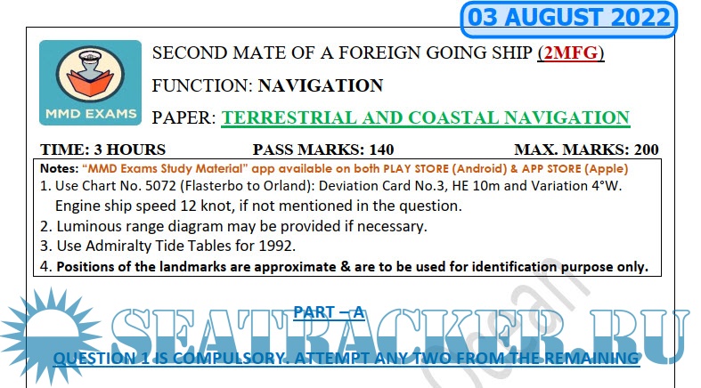 Question Paper Set for Terrestrial and Coastal Navigation (August 2022) for Second Mate (F.G.) Mercantile Marine Department (MMD), India Examinations