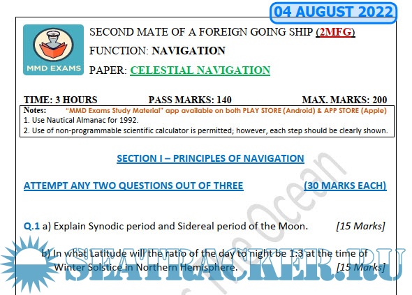 Question Paper Set for Celestial Navigation (August 2022) for Second Mate (F.G.) Mercantile Marine Department (MMD), India Examinations