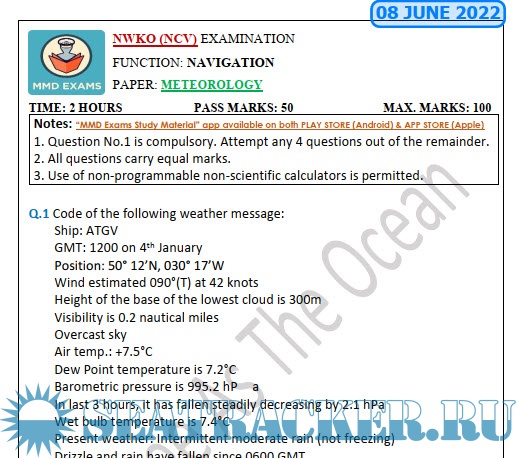 Question Paper Set for Meteorology (June 2022) for NWKO (NCV) Mercantile Marine Department (MMD), India Examinations