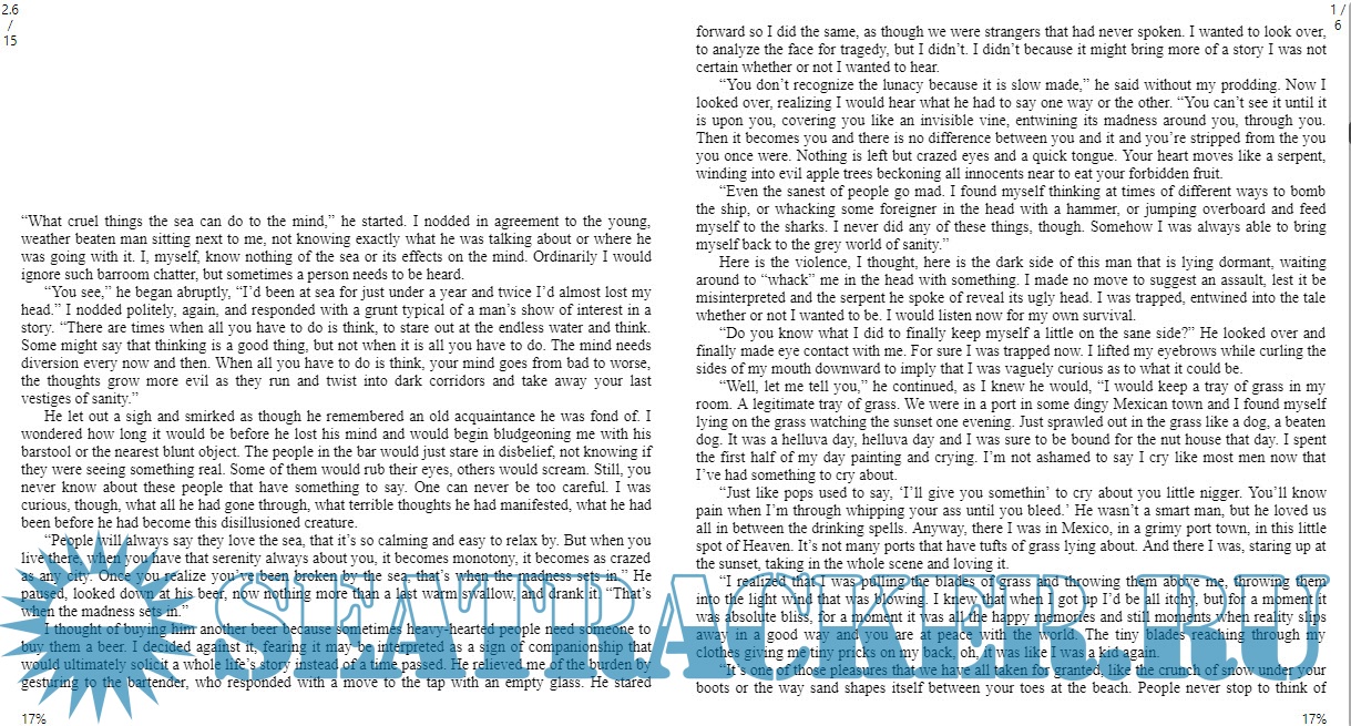 “What cruel things the sea can do to the mind,” he started. I nodded in agreement to the young, weather beaten man sitting next to me, not knowing exactly what he was talking about or where he was going with it. I, myself, know nothing of the sea or its effects on the mind. Ordinarily I would ignore such barroom chatter, but sometimes a person needs to be heard.