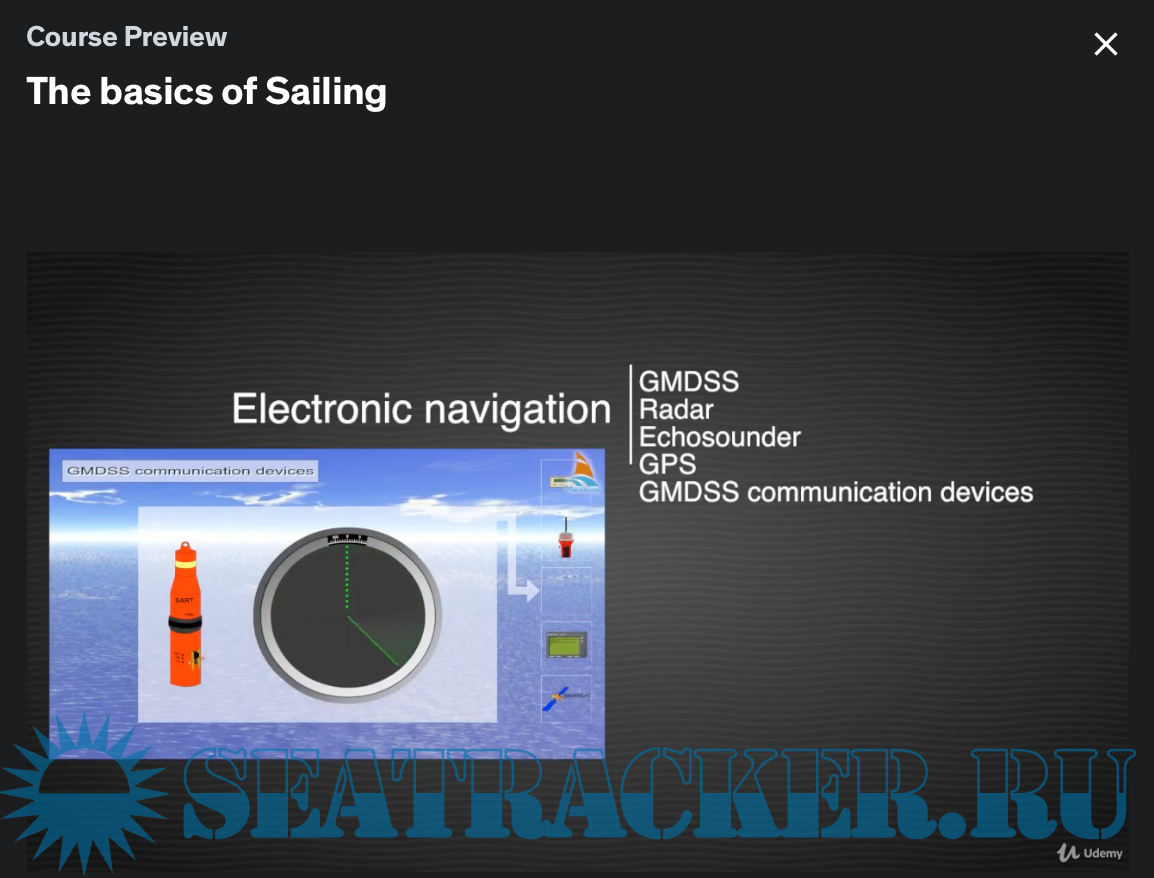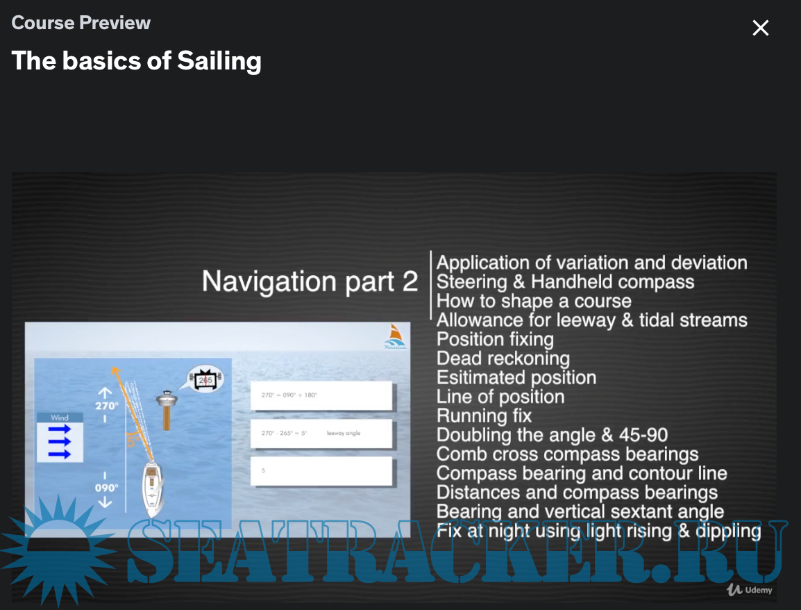 Year: 2018 Language: english Genre: Udemy eLearning Video Playtime: 8 sections • 39 lectures • 4h 27m total length + SRT Quality: HD Format: MP4 Video: H.264 1280x720 30 fps Audio: AAC 48.0 KHz x 320 Kbps Description: Sailing the open seas is the ultimate freedom! Wide skies, fresh air, camaraderie, it’s all there for you and our course can help you to get it. This is probably the most complete, interactive, engaging, and fun, sailing course ever made. Imagine an entire interactive, highly organized, library of sailing knowledge at your fingertips whenever you want it! Created for beginners, intermediate, and advanced sailors - all wrapped up into one.. Course includes more than 300 animations with voice over in English Lessons are in Full HD quality and covers all the main maritime subjects. Who this course is for: Sailing the open seas is the ultimate freedom! This course can help you get it! It's useful to anyone who is interested in sailing. What you'll learn: Course is designed to provide up-to-date, engaging information and instruction about all the vital aspects of sailing. Students will be able to understand basic knowledge of safety, coastal navigation, tides and currents, aids to navigation, buoyage system, navigation in restricted