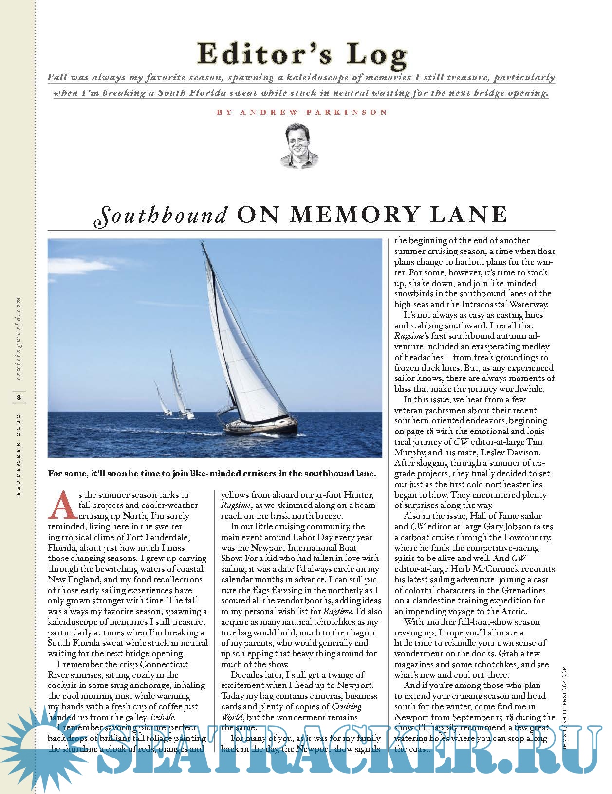 Year: 2022 Language: english Author: Andrew Parkinson Genre: Periodical (magazine) Publisher: A Bonnier Corporation Company Edition: September Format: PDF Quality: Photo of pages Pages count: 102 Description: Cruising World is your passport for exploring the world's coastlines and oceans while voyaging under sail. Its contributors inspire and entertain through stories, pictures and videos that underscore the beauty and adventure of sailing, while providing instruction on the disciplines of seamanship, navigation and boat handling.