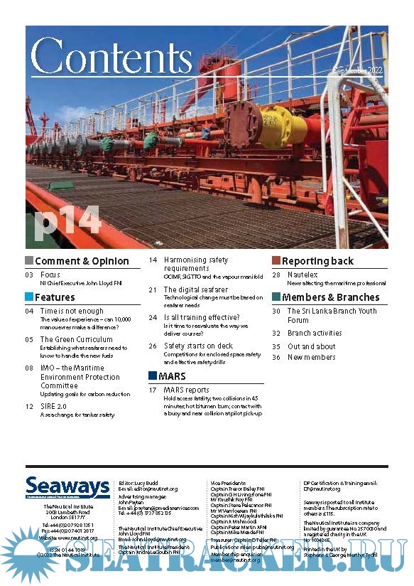 Year: 2022 Language: english Author: The Nautical Institute Genre: Periodical (magazine) Format: PDF Quality: eBook Pages count: 40 Description: Edition September, 2022 Seaways Recognised as one of the leading maritime journals, Seaways is sent out to all members monthly. It is the international journal of The Nautical Institute and has the most vibrant professional correspondence section to be found anywhere in the industry.