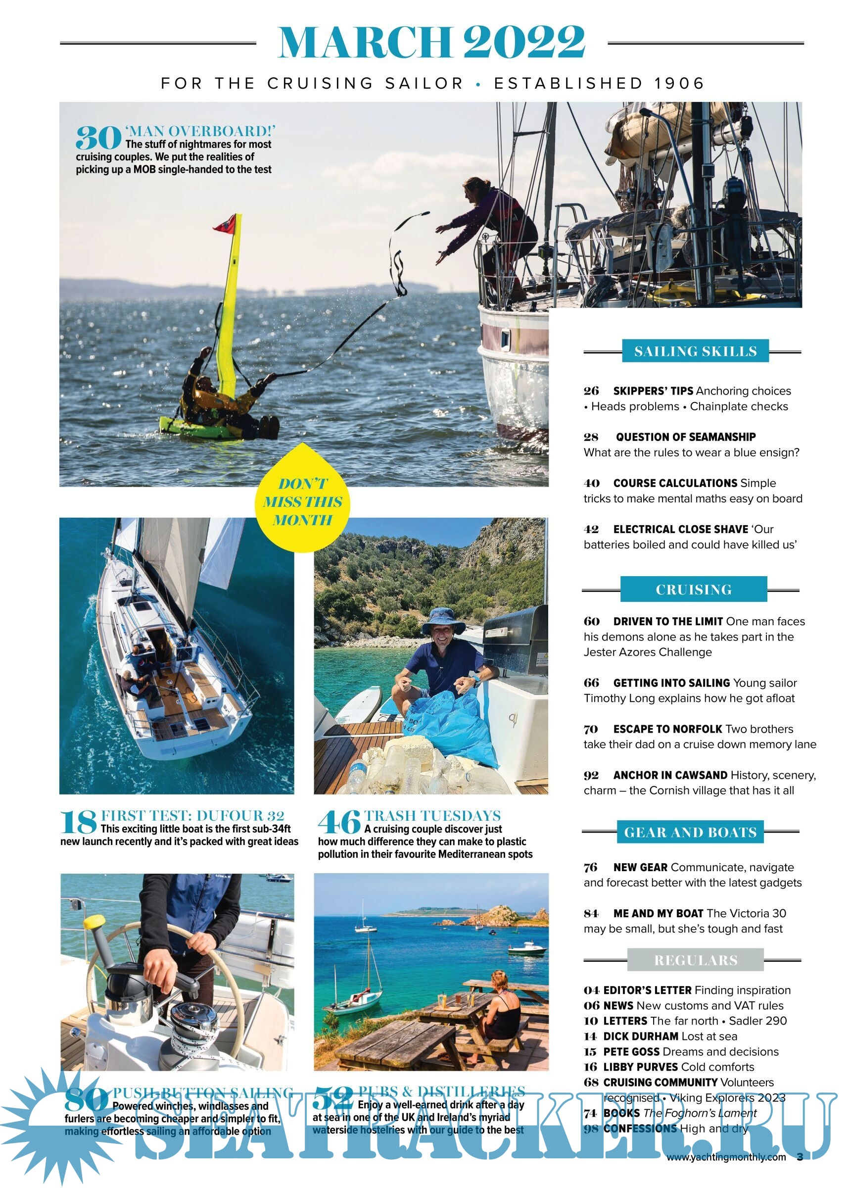 Year: 2022 Language: english Author: Theo Stocker Genre: Periodical (magazine) Publisher: Future Publishing Limited Edition: March 2022 Format: PDF Quality: Photo of pages Pages count: 100 Description: Yachting Monthly is at the heart of the British yachting market and is for people who actively sail their boats – whether cruising across the channel, around the coast or further afield in blue waters.It provides an entertaining mix of vital information for cruising yachtsmen with all levels of experience, which maximises their enjoyment, increases their skills and gives them the confidence to broaden their horizons.