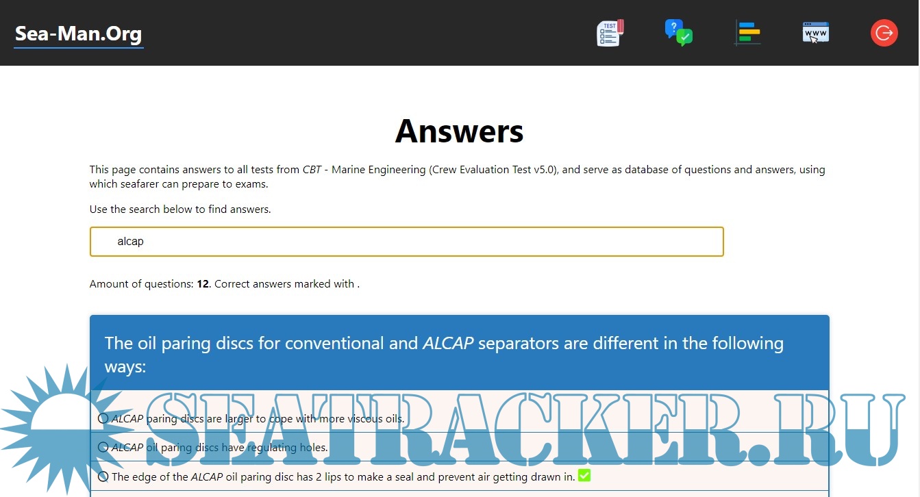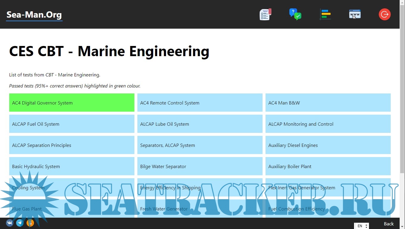 Year: 2022 Version: v1.1.1 Developer: Alex Lestra Platform: Windows 64-bit OS compatibility: yes System Requirements: OS: Windows 7, 8, 10 RAM: 1 GB Graphics: any Storage: 174 mb Localization: english Crack: Not needed Description: Tests from Seagull CES CBT - Marine Engineering (v5.0), which contains 27 tests: AC4 Digital Governor System, AC4 Remote Control System, ALCAP Fuel Oil System, ALCAP Lube Oil System, ALCAP Monitoring and Control, ALCAP Separation Principles, Separators, ALCAP System, Auxiliary Diesel Engines, Basic Hydraulic System, Bilge Water Separator, Auxiliary Boiler Plant, Cooling System, Energy Efficiency in Shipping, Flex Inert Gas Generator System, Flue Gas Plant, Fresh Water Generator, Fuel Combustion Efficiency, Fuel Oil System, On Board Incinerator, TeamTec Incinerator, Inert Gas Generator, Marine Fuel Handling, Marine Lubricants, Pumps and Pumping Operations, Basic Refrigeration Theory, Operation of Steering Gear, Sulzer Medium Speed Diesel Engine. Features: * 27 tests with possibility to pass them and to see your result and errors. * 787 questions and answers from this tests. * rating system, which saves your best results. Installation: 1. Unpack .rar archive anywhere. 2. Launch cbt_MarineEng_en.exe Additional info: For version with russian localization please visit this thread https://seatracker.xyz/viewtopic.php?t=52964 I am a developer of this program, and I am happy what a lot of people find it useful, and what they asked for version with English UI. This is big motivation for me, thank you. If you find any errors, bugs etc, please let me know here in this thread, or (better) mail me: [email protected] Any suggestions appreciated. With best regards Alex "NarkiDarki" Lestra.