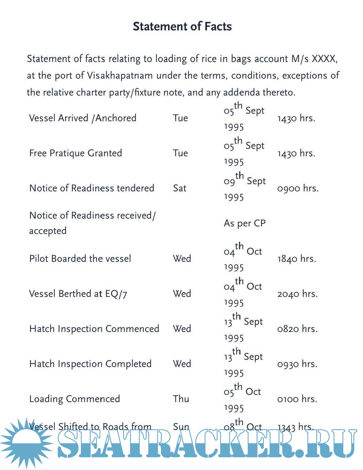 This book uses many examples of laytime calculations. Copies of the original statement of facts, charter party agreements have also been used in this book with some modifications to hide some of the vital content relating to buyers/sellers.