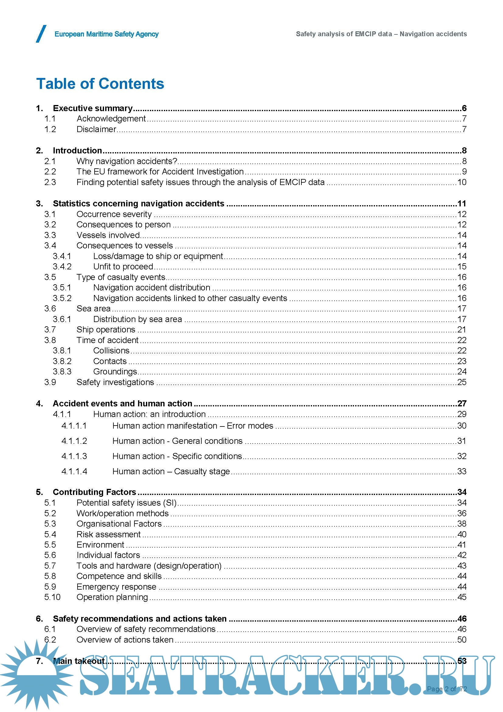 Description: This safety analysis of the European Marine Casualty Information Platform (EMCIP) data focuses on navigation accidents (i.e. collisions, groundings and contacts), given their visibility and relevance in the context of maritime safety. In particular, a significant amount of occurrences involving navigation accidents have been reported in EMCIP, covering around 28% of the overall dataset. The EMSA methodology has been applied to detect potential safety issues reported in the system, focusing on the “human element”. The analysis considered different types of vessels such as passenger ships, cargo ships and service ships.
