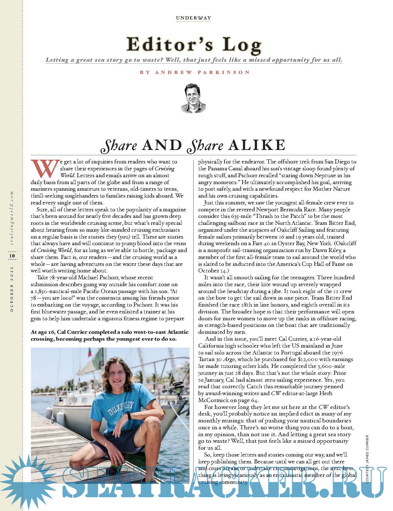 Year: 2022 Language: english Author: Andrew Parkinson Genre: Periodical (magazine) Publisher: A Bonnier Corporation Company Edition: October 2022 Format: PDF Quality: Photo of pages Pages count: 124 Description: Cruising World is your passport for exploring the world's coastlines and oceans while voyaging under sail. Its contributors inspire and entertain through stories, pictures and videos that underscore the beauty and adventure of sailing, while providing instruction on the disciplines of seamanship, navigation and boat handling.