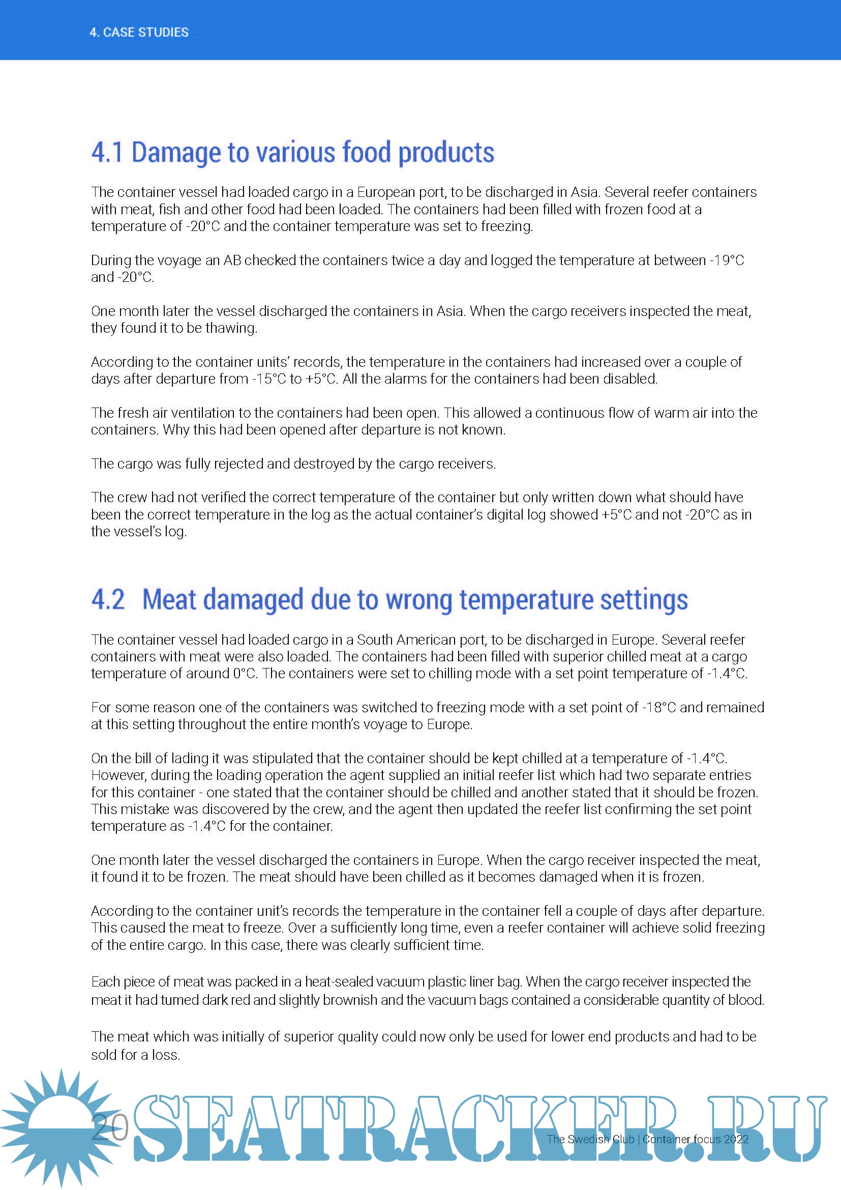 Description: Container focus: Refrigerated cargo analysis, a new loss prevention report from The Swedish Club focuses on the most common causes of refrigerated cargo - ´reefer´ - container claims, and provides analysis, case studies and loss prevention advice.