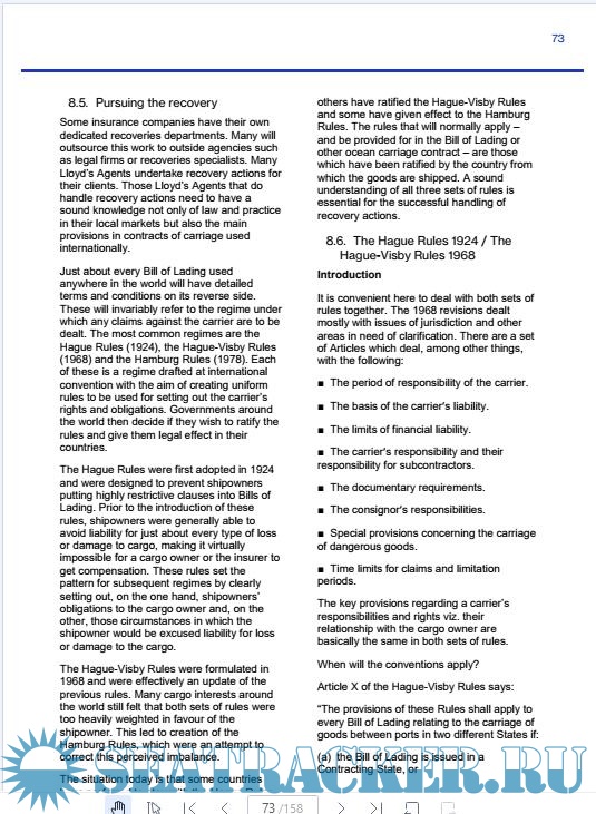 Year: 2019 Language: english Author: Lloyds Genre: Manual Publisher: Lloyds Edition: 1 Format: PDF Quality: eBook Pages count: 158 Description: The Lloyd’s Agency Department is committed to raising service standards and has devised two comprehensive marine cargo examination programmes which are compulsory for all Lloyd’s Agents. This publication, Cargo Claims and Recoveries – Module 3, covers three inter- related subjects: ■ The handling and adjustment of claims under policies of insurance on cargo. ■ The handling of recovery actions against third parties. ■ General average and salvage.