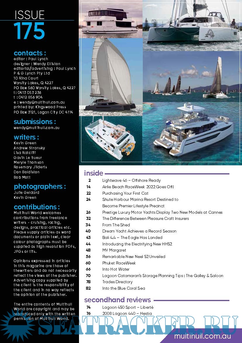 Year: 2022 Language: english Author: Paul Lynch Genre: Periodical (magazine) Edition: November, December 2022 Format: PDF Quality: Photo of pages Pages count: 92 Description: Multihull World is an Australian-based specialist publication devoted to multihull enthusiasts - catamarans and trimarans, offshore, off-the-beach, power, racing and cruising.