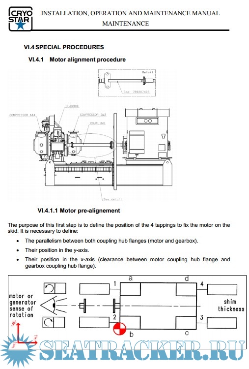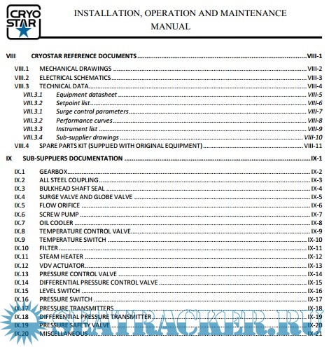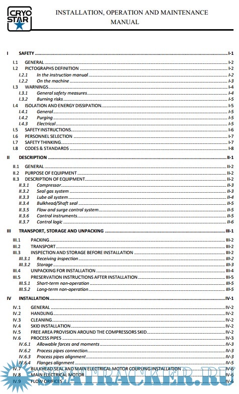 Year: 2013 Language: english Author: Cryostar Format: PDF Quality: eBook Pages count: 1186 Description: This instruction manual covers a four-stage compressor system, manufactured by CRYOSTAR SAS. These instructions include installation, operation, maintenance and preservation recommendations The four-stage compressor system is skid-mounted as shown on the equipment layout drawing. The P&I diagram presents a complete flow schematic of the compressor system. The system consists of an integrally-geared compressor with the following subsystems: • Local control panel for the operation and the monitoring of the unit (installed next to the skid). • Compressor variable diffusor vanes. • Seal gas system. • Self-contained lube oil system for the lubrification of the gears and the rotor bearings in the gearbox. • Oil demister. • Lube oil immersion heater. • Lube oil cooler. • Double oil filter. • Electrical auxiliary lube oil pump. • Gear-driven main lube oil pump. • Coupling (installed on the low speed shaft of the gearbox). Thank you!
