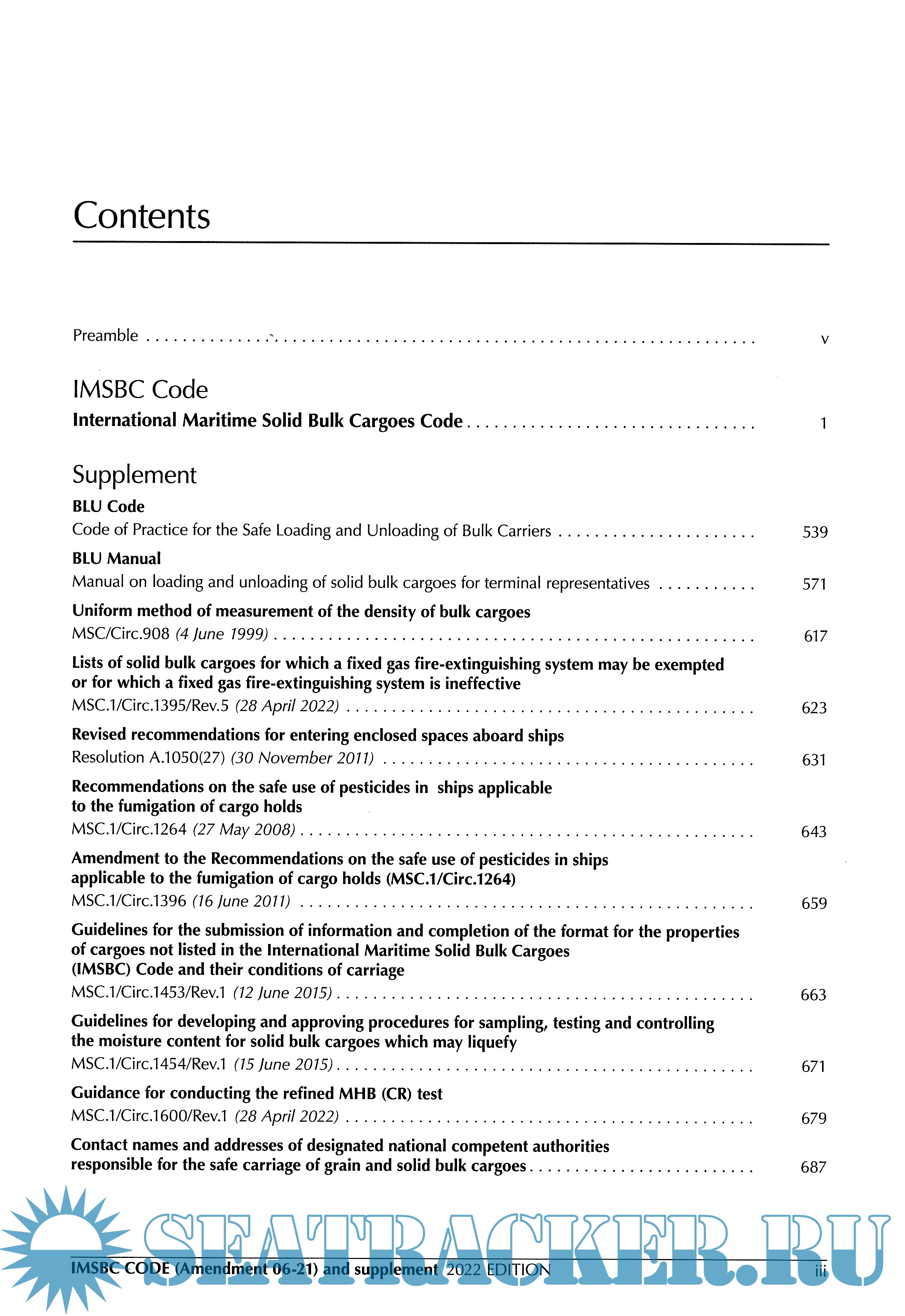 Year: 2022 Language: english Author: IMO Genre: Convention (rules) Publisher: IMO Edition: 2022 ISBN: 978-92-801-1746-2 Format: PDF Quality: Scanned pages + OCR Pages count: 737 Description: The primary aim of the International Maritime Solid Bulk Cargoes Code (IMSBC Code), which replaces the Code of Safe Practice for Solid Bulk Cargoes (BC Code), is to facilitate the safe stowage and shipment of solid bulk cargoes by providing information on the dangers associated with the shipment of certain types of solid bulk cargoes and instructions on the procedures to be adopted when the shipment of solid bulk cargoes is contemplated. The IMSBC Code, adopted on 4 December 2008 by resolution MSC.268(85), entered into force on 1 January 2011, from which date it was made mandatory under the provisions of the SOLAS Convention. The Code has been amended by resolutions adopted by the Maritime Safety Committee, the most recent being resolution MSC.500(105), incorporating Amendment 06-21, which may be applied from 1 January 2023 on a voluntary basis, and has an official entry into force on 1 December 2023. In order to keep pace with the expansion and progress of industry, the IMSBC Code, as amended, includes: • Modifications to various existing individual schedules for solid bulk cargoes. • New individual schedules for such cargoes as ammonium nitrate based fertilizer, ammonium nitrate based fertilizer MHB, clam shell, leach residue containing lead and superphosphate (triple, granular). • New definitions (including an updated definition for group A cargoes), references and requirements for cargoes which may undergo dynamic separation. This publication presents additional information to supplement the IMSBC Code, such as the Code of Practice for the Safe Loading and Unloading of Bulk Carriers (BLU Code), the Manual on loading and unloading of solid bulk cargoes for terminal representatives (BLU Manual) and recommendations on the safe use of pesticides in ships applicable to the fumigation of cargo holds. It also includes a directory of contact names and addresses of offices of designated national competent authorities responsible for the safe carriage of grain and solid bulk cargoes. The IMSBC Code and supplement is commended to Administrations, shipowners, shippers and masters and all others concerned with the standards to be applied in the safe stowage and shipment of solid bulk cargoes, excluding grain.