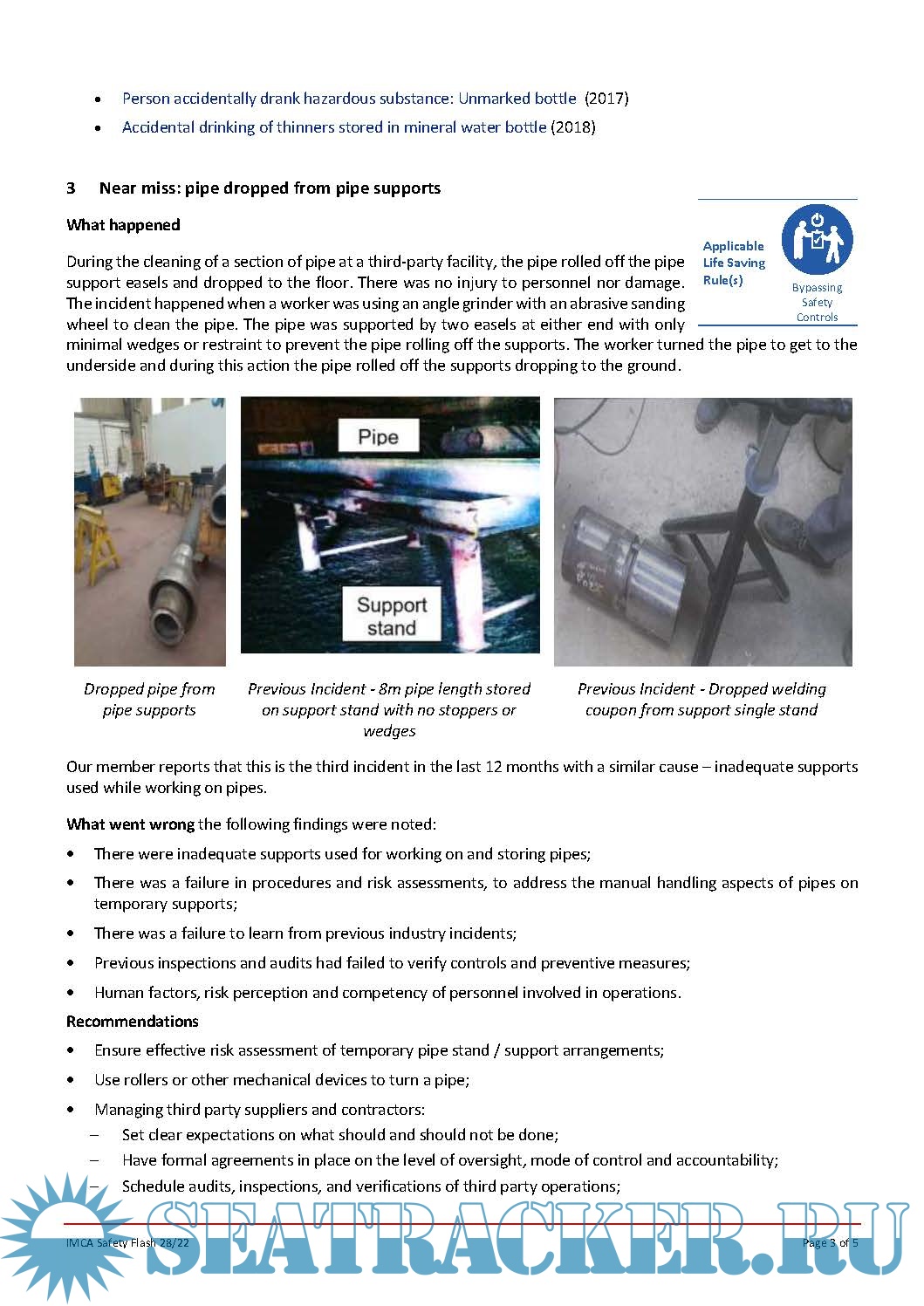 IMCA SF 28/22 • MAIB: Worker falls between vessel and quay • Accidental swallowing of paint thinners • Near miss: pipe dropped from pipe supports • Oil tank sight glass push buttons wired open • BSEE: Unsafe chemical use and disposal