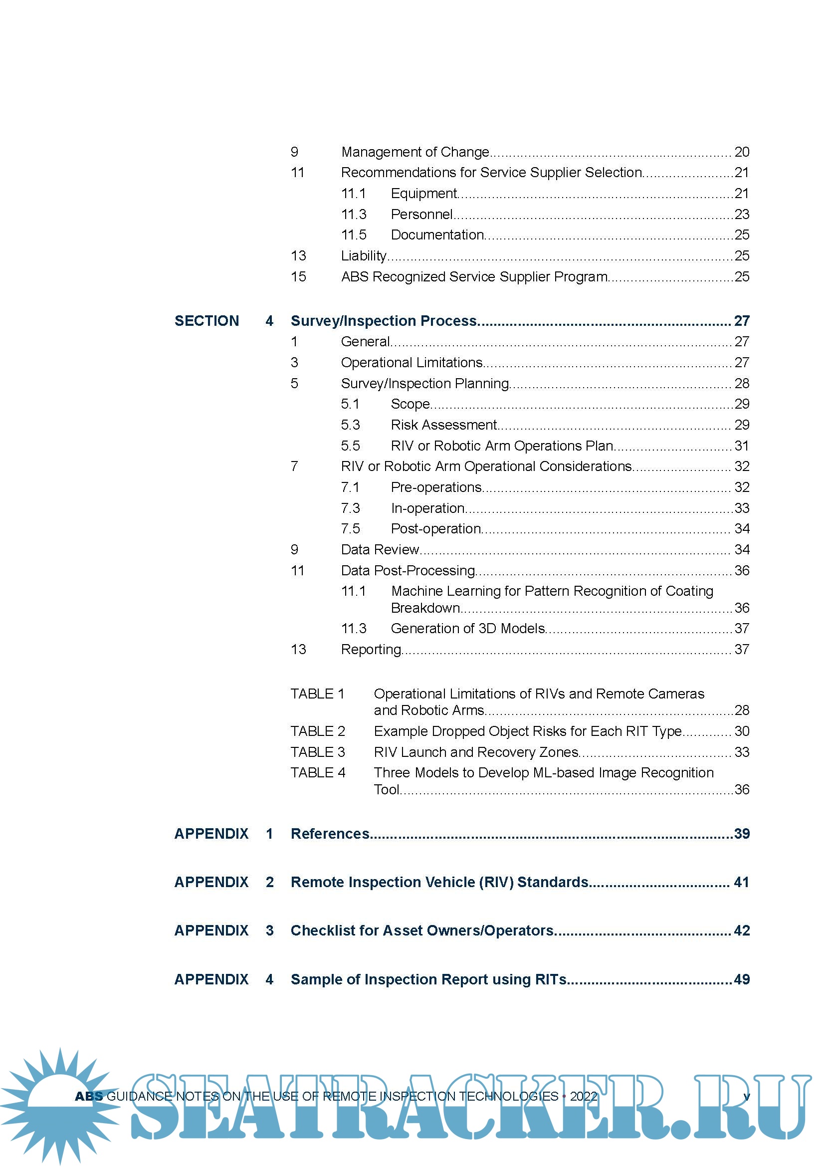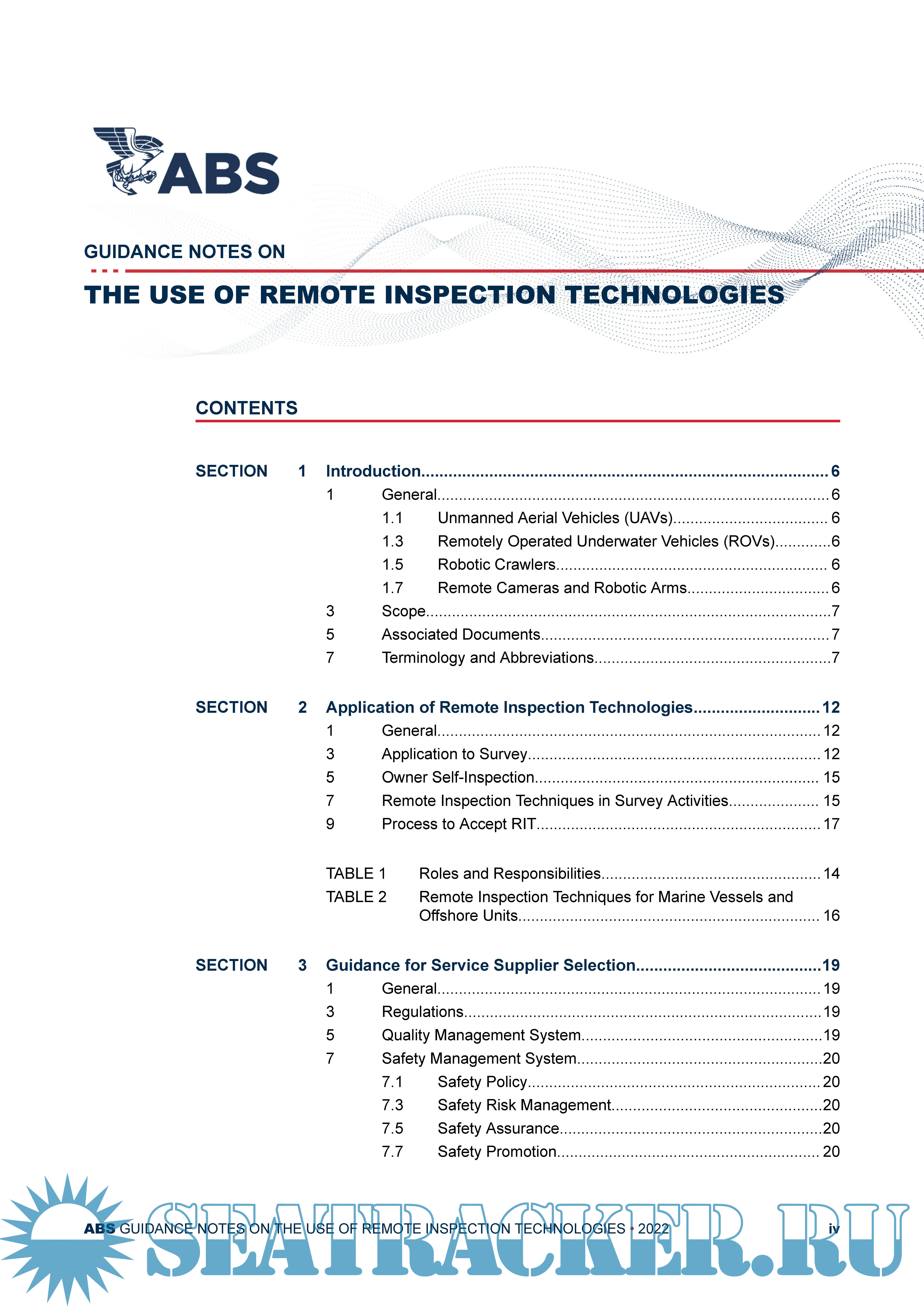 Year: 2022 Language: english Author: ABS Genre: Guide Edition: December, 2022 Format: PDF Quality: eBook Pages count: 52 Description: There are different remote inspection technologies (RITs) that can assist the attending Surveyor in evaluating a structure’s condition. These RITs may be installed on remote inspection vehicles or robotic arms. Vehicles and robotic arms allow for collecting digital data to support an assessment of the structure's condition and identify anomalies. This data may include photos, videos, light detection and range (LiDAR) data, and other NDE data. The remote inspection vehicle (RIV) is a remotely controlled vehicle operating in the air, underwater, or on structures. Some common types of RIV include Unmanned Aerial Vehicles (UAVs), Remotely Operated Underwater Vehicles (ROVs), and robotic crawlers. These RITs also benefit the asset Owner/Operator by reducing operational intrusiveness. These Guidance Notes offer best practices for class surveys and non-class inspections using RITs. These best practices include recommendations and guidance on applications of RITs, technology qualification, and proficiency of the remote inspection Service Suppliers, RIV operation, data handling, and data analysis. These best practices are intended to facilitate a safer, more effective, and efficient survey. The following IACS Recommendations and Requirements were considered in the development of these Guidance Notes.