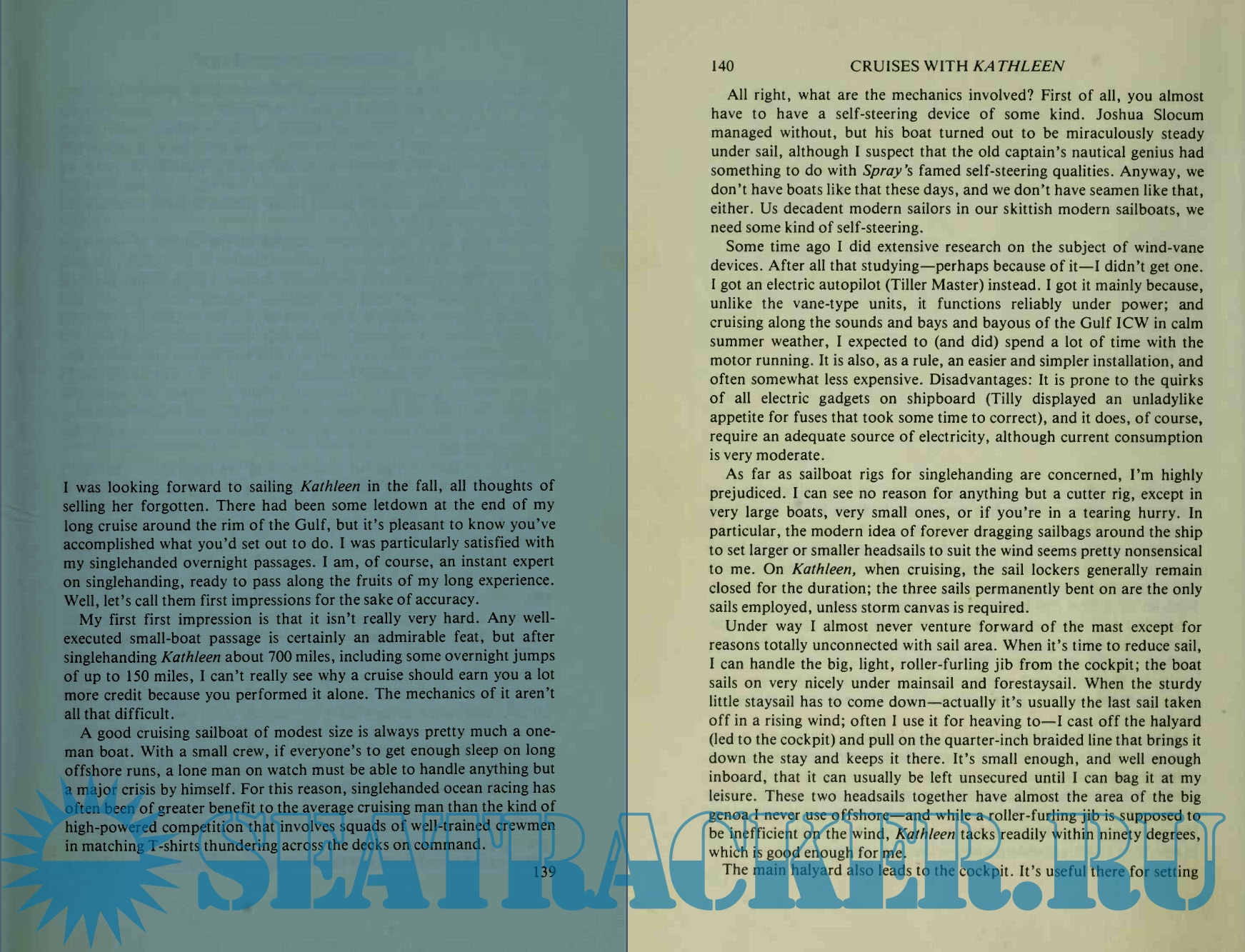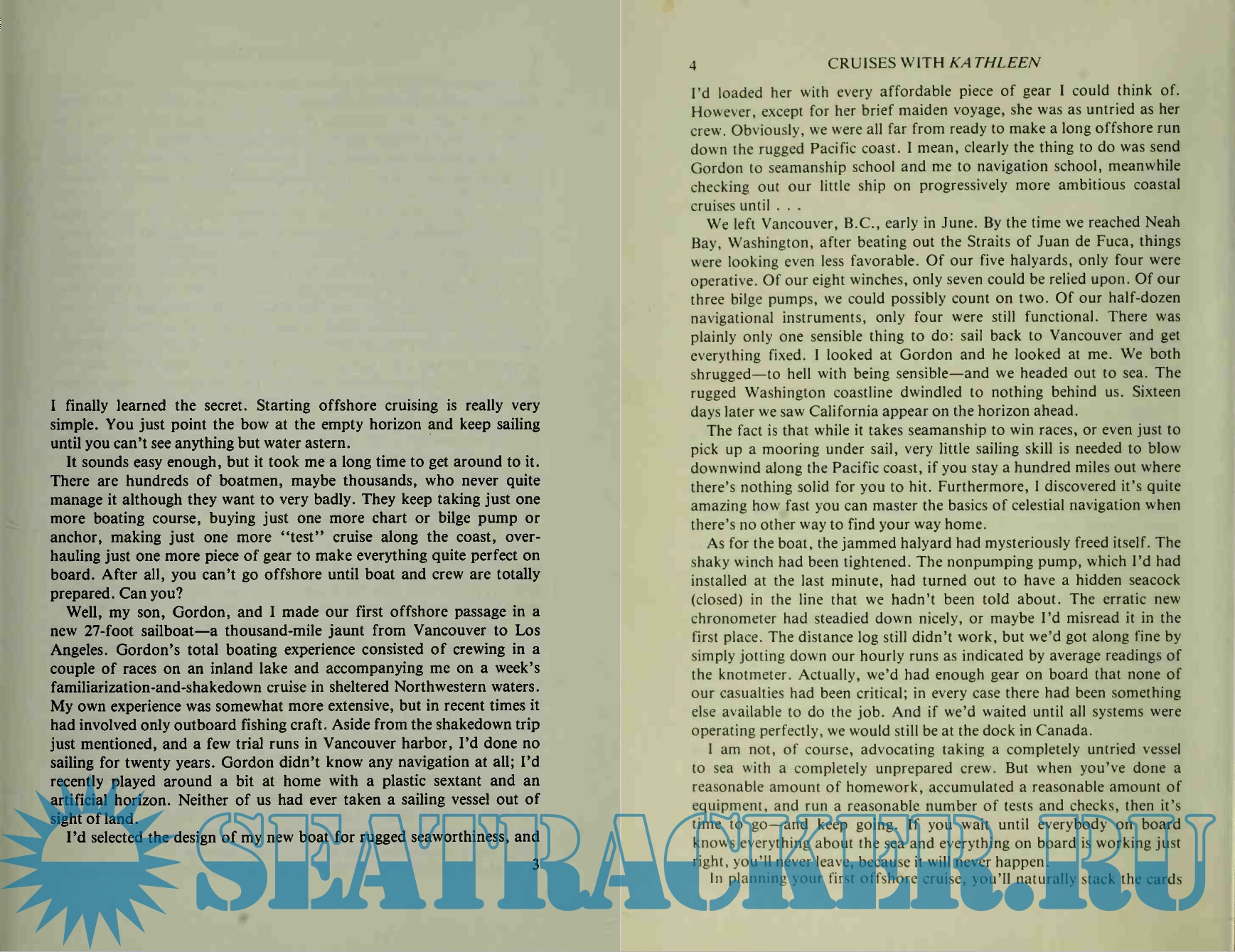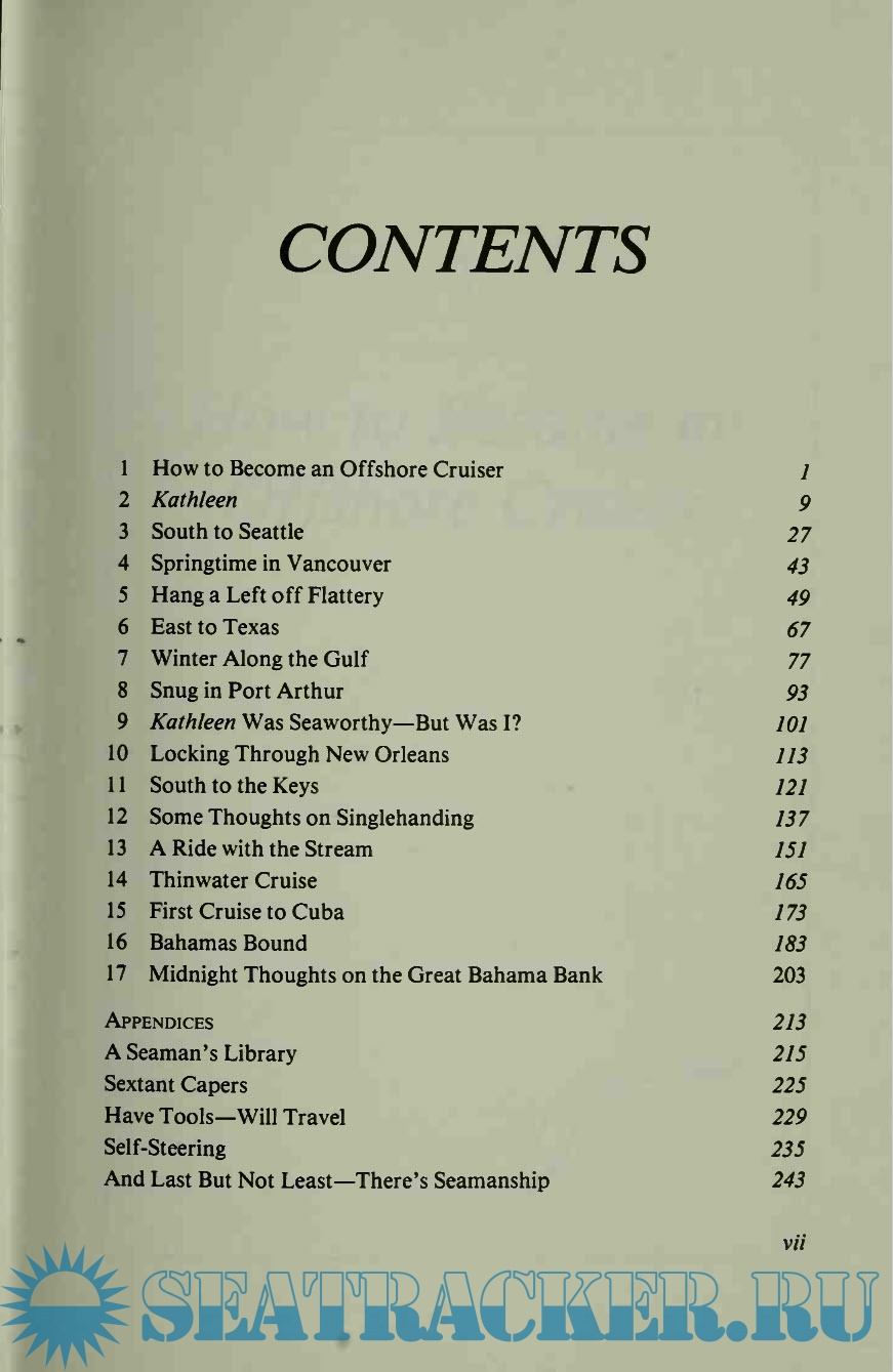 Description: Kathleen's cruises weren't epic voyages, but when the creator of the Matt Helm thriller series gives up power boats and returns tot he sea under sail, the result is sometimes traumatic, often joyful, and always interesting. Donald Hamilton, author and sailor, is an inquiring and opinionated man, whose salty advice on everything from hull design to electronic gadgets is well worth reading and heeding.