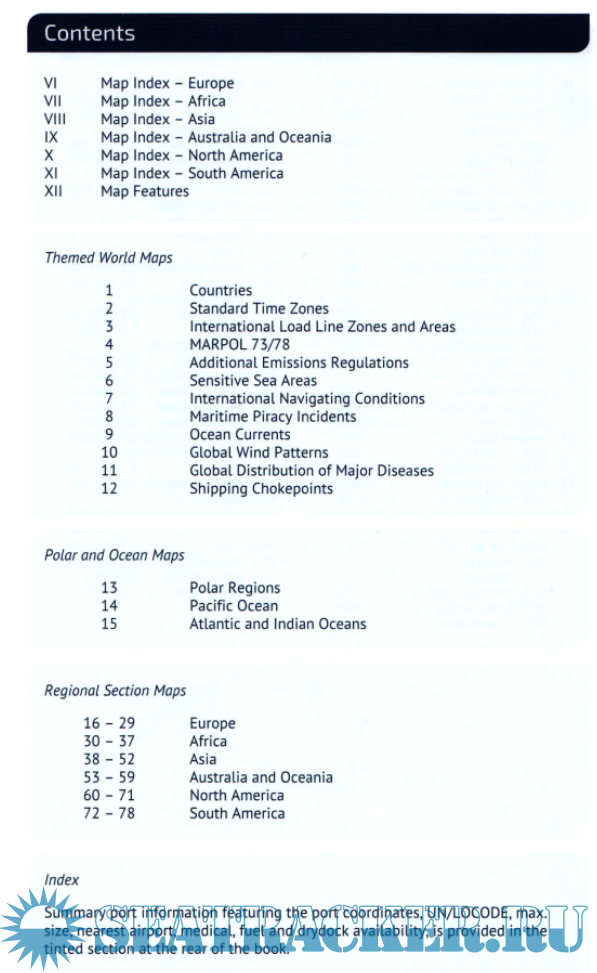 Three distinct sections are available starting with themed global maps on topic subjects such as MARPOL regulations, followed by over 60 pages of detailed map content displaying port and terminal locations, and finishing with the comprehensive port and terminal index. The essential supplementary information included within the index provides the exact port coordinates, official LOCODE, maximum size of vessel permissible by cargo type, nearest regional and international airports available for crew repatriation, refuelling availability, drydock availability and the nearest medical facilities.