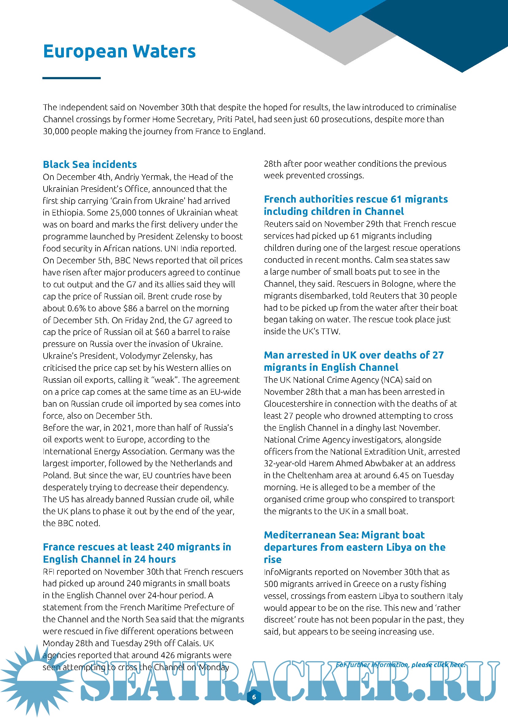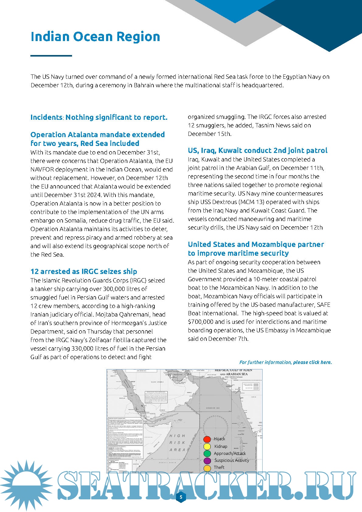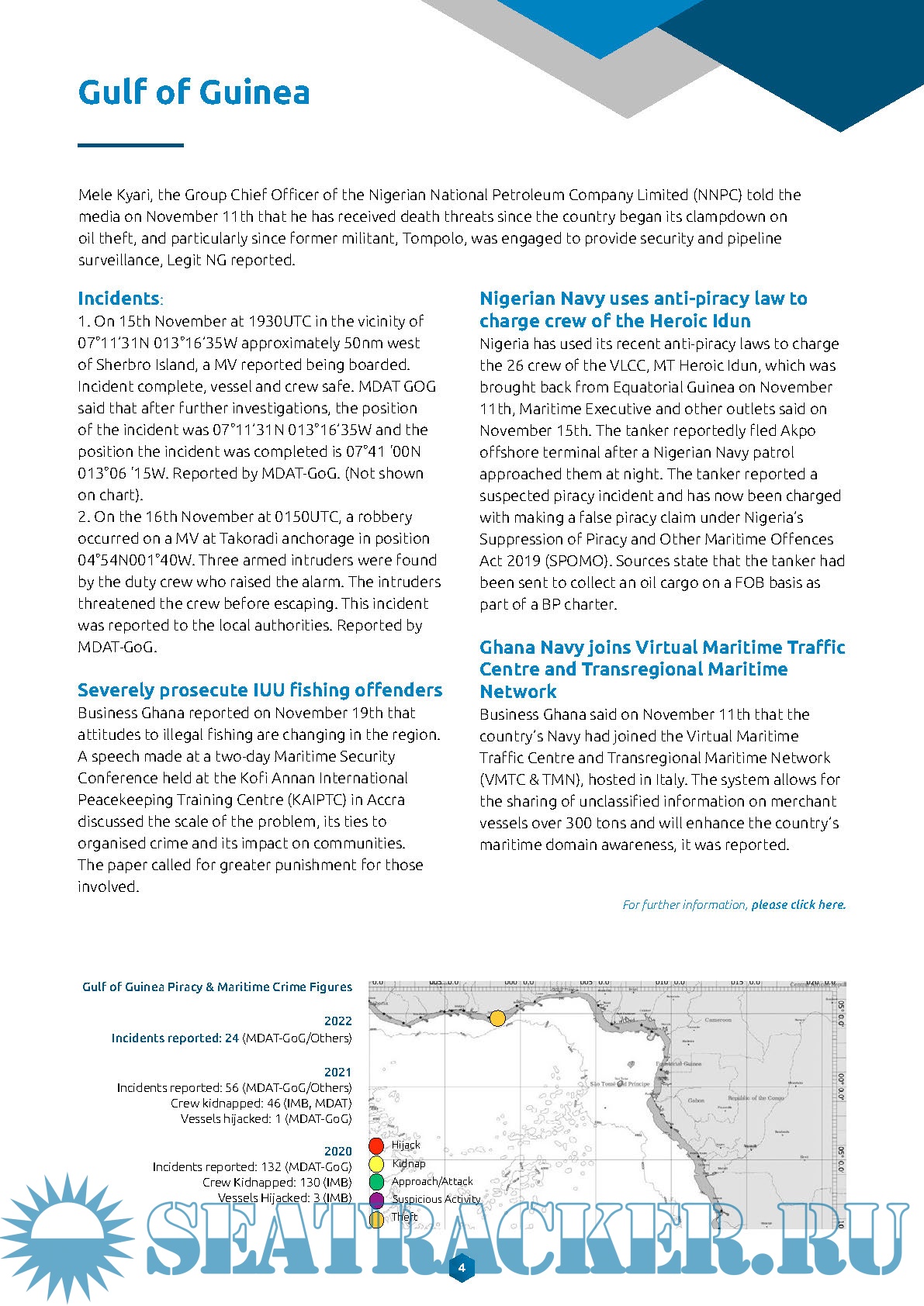 Year: 2022 Language: english Author: Maritime Asset Security and Training (MAST) Genre: Other Format: PDF Quality: eBook Pages count: 28 Description: This report is intended to provide general information about maritime intelligence topics but does not provide individual advice and the creators assume no liability for the accuracy, completeness or adequacy of any information contained herein, or through links you will find in it. Furthermore, using this report or sending MAST emails does not create a service provider- client relationship. It is intended only as an introduction to ideas and concepts only. It should not be treated as a definitive guide, nor should it be considered to cover every area of concern or regarded as an advice. Issues nos. 356-359 November - December, 2022