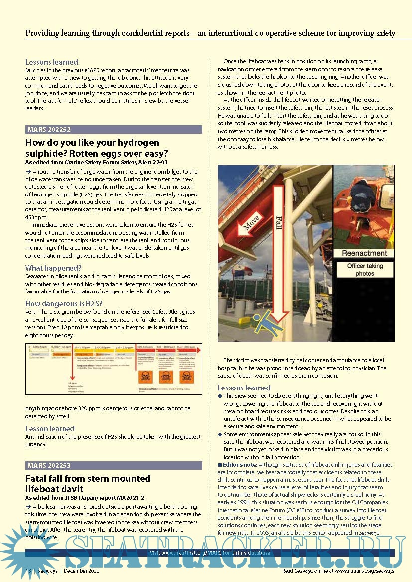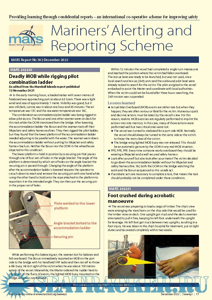 Year: 2022 Language: english Author: The Nautical Institute Genre: Periodical (magazine) Format: PDF Quality: eBook Pages count: 4 Description: MARS Report No.362 December, 2022 Providing learning through confidential reports – an international co-operative scheme for improving safety.MARS is a searchable database containing reports of accidents and near misses stretching back over a quarter of a century. Funded through the generous support of the Institute's Nautical Affiliate partners, it is one of the maritime industry's leading risk reduction initiatives and is helping to make life safer for seafarers everywhere
