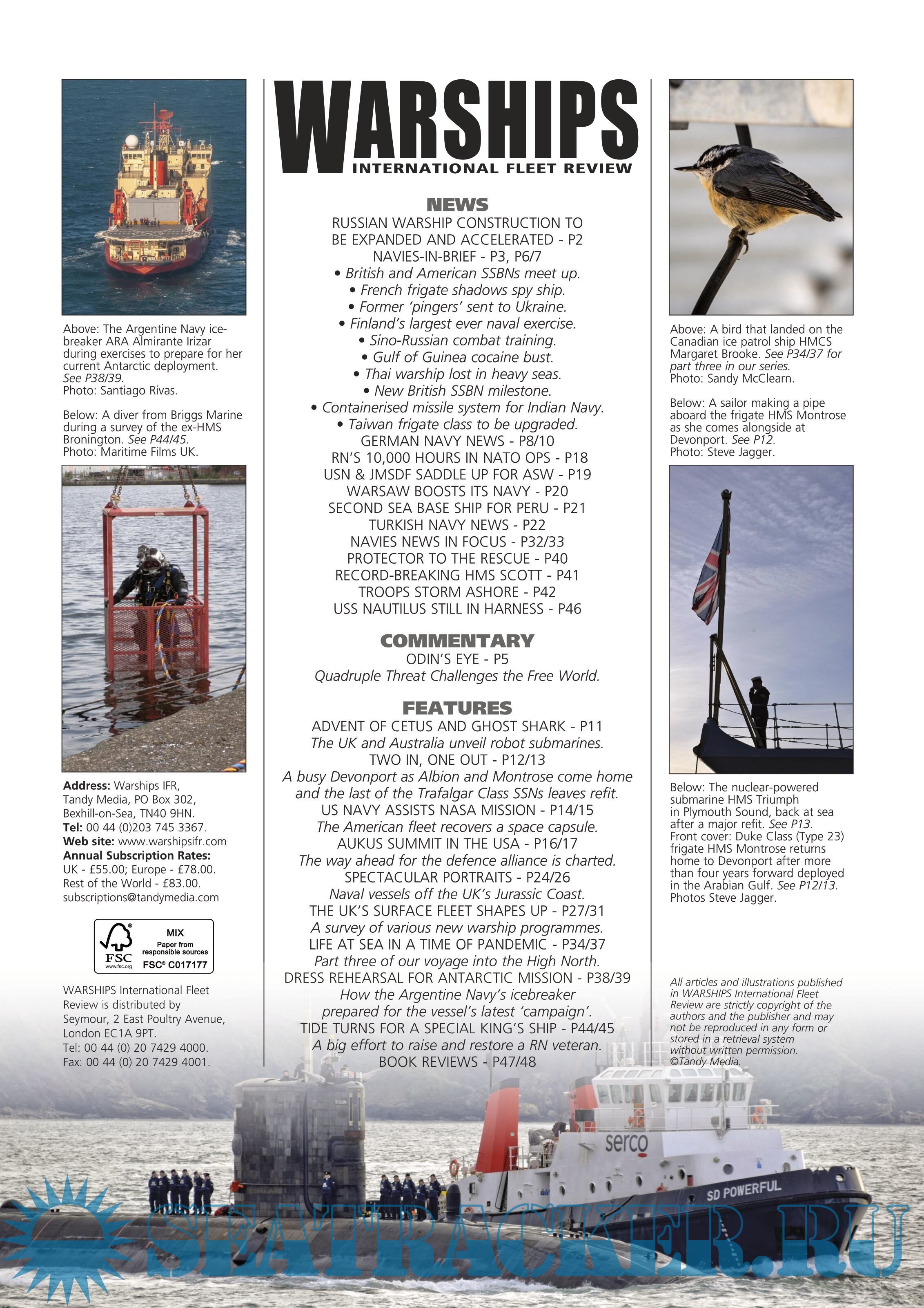 WARSHIPS International Fleet Review is published 12 times a year by Tandy Media Ltd who also publish Shipping Today & Yesterday (which provides news and features from the world of merchant shipping).