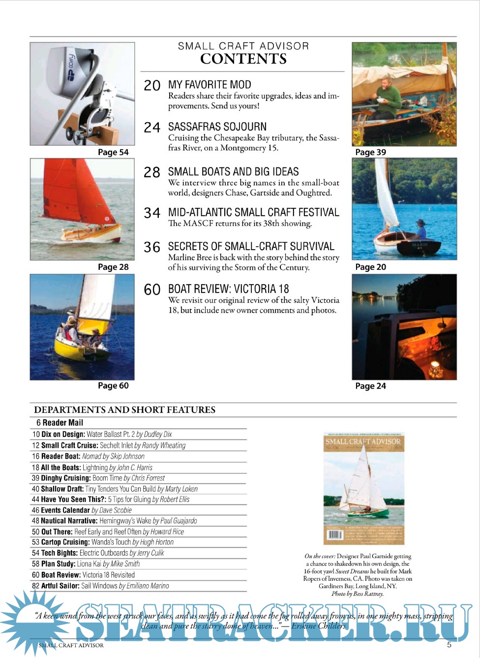 Description: Small boats, big adventure! The only magazine focused on small and trailerable sailboats, cruising, and adventure. Each issue features places to sail, how-to and modification articles, a plan study for the boat builder, and a feature-length review of a production sailboat.